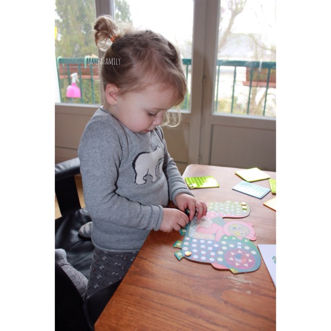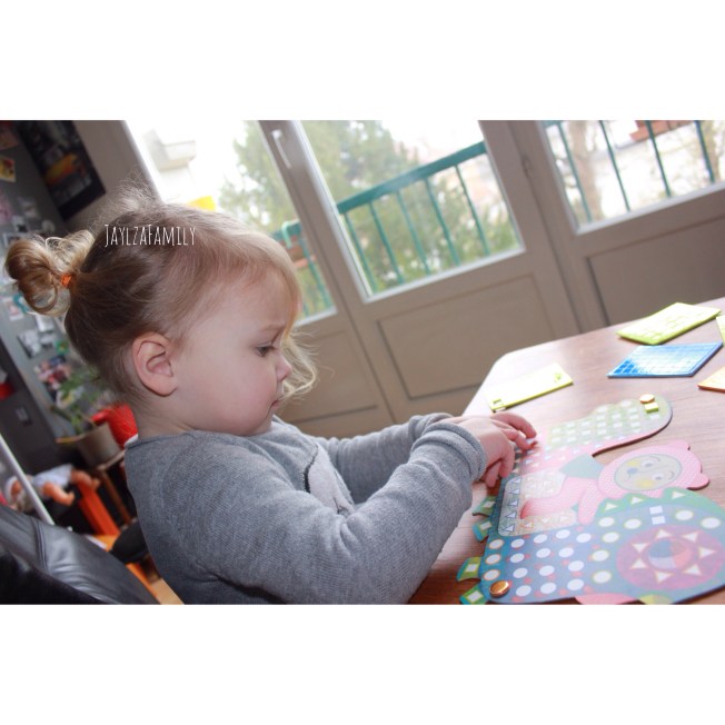 Les gommettes sont faciles à manipuler pour les petites mains, elles se détachent bien, et collent très bien sur les planches! On peut dire qu’on n’a pas vraiment le droit de se louper quand on positionne la gommette.