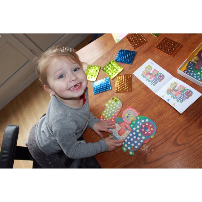 On a donc testé le kit des mosaïques à califourchon pour les 3-6 ans! J’avais un peu peur que Tchoupine soit un peu petite pour réaliser ces mosaïques, mais elle m’a épatée! Concentrée, précise et enthousiaste. Je m’attendais à ce qu’elle ne respecte pas toutes les consignes (du genre les bonnes couleurs surtout!), je me suis trompée.