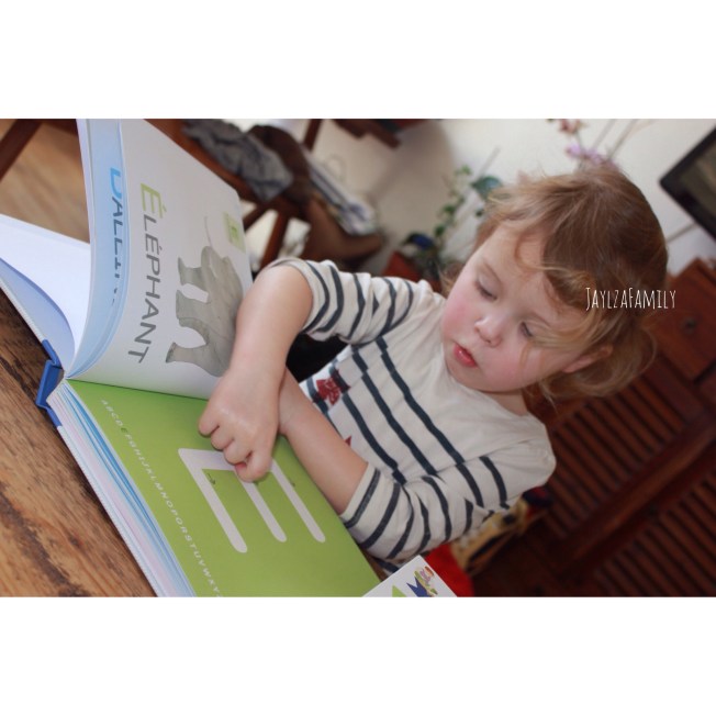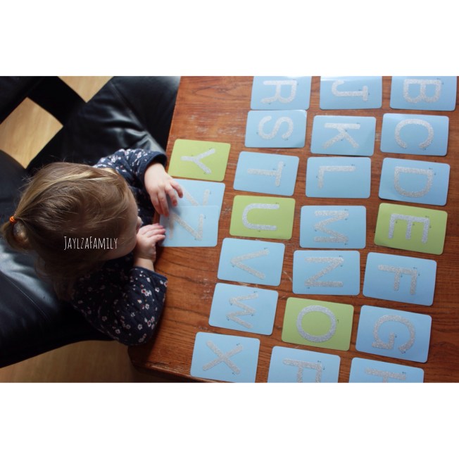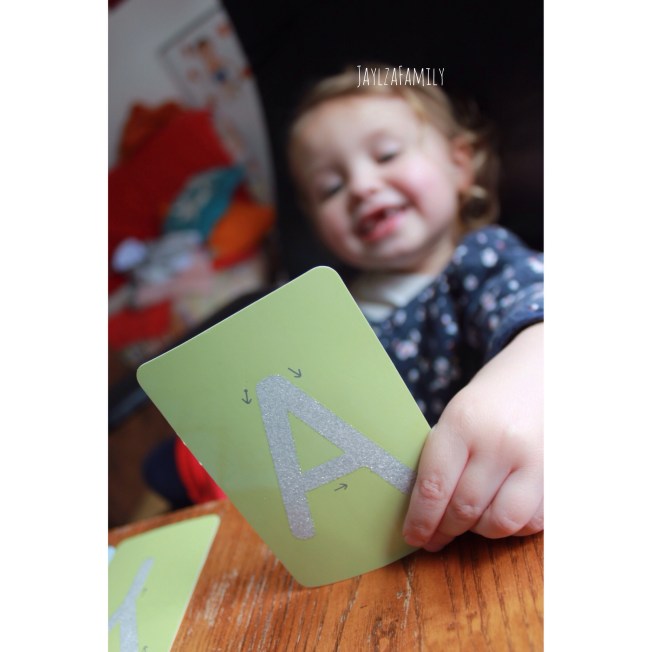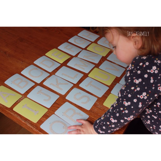 On a décidé de faire comme un jeu de mémo en étalant toutes les cartes d’un premier jeu de l’alphabet sur la table et en donnant à Tchoupine une carte par une carte de l’autre jeu qu’elle doit poser sur sa jumelle. Elle repère, elle la pose et suit du doigt la lettre pour s’en imprégner (en suivant les petites flèches).