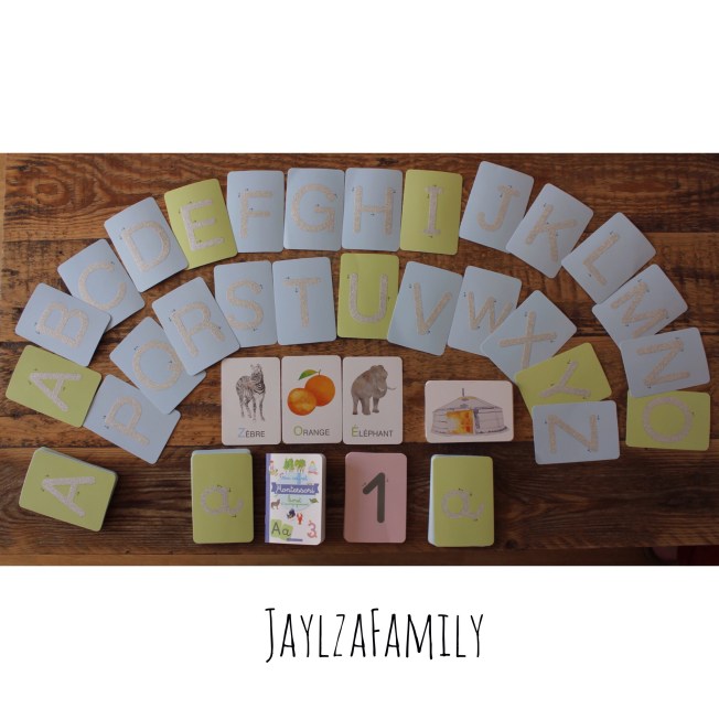 Celui qu’on a découvert aujourd’hui est « Mon grand coffret Montessori des lettres rugueuses majuscules et cursives« . Il se compose de 104 lettres rugueuses (2 jeux de lettres majuscules, 2 jeux de lettres cursives), 26 cartes images, 10 cartes chiffres et un livret d’activités.