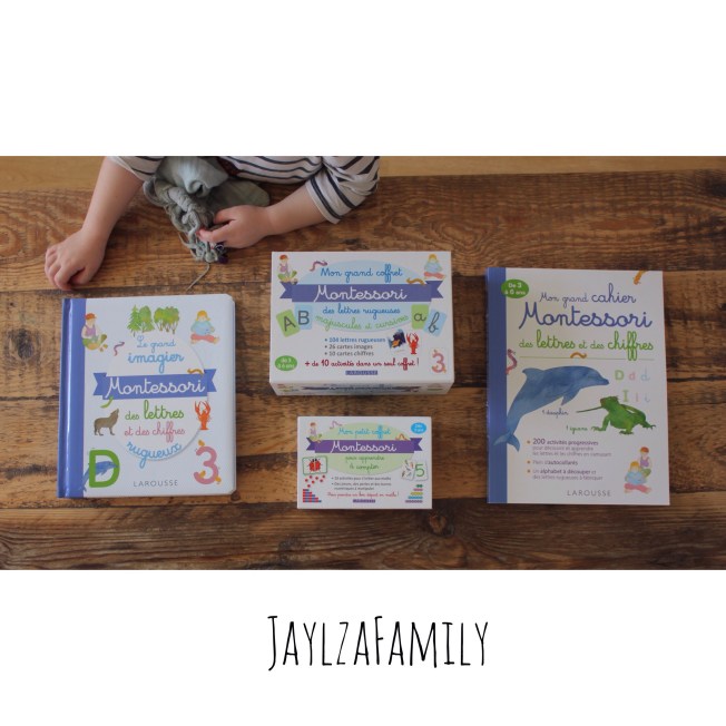 Aujourd’hui, c’est une activité Montessori qu’on te propose! Tu sais déjà que Tchoupine est dans une école Montessori. On a voulu prolonger ses activités scolaires à la maison. Alors pour son anniversaire, elle a reçu de beaux coffrets et livres Larousse pour continuer à se familiariser avec les lettres et les chiffres.