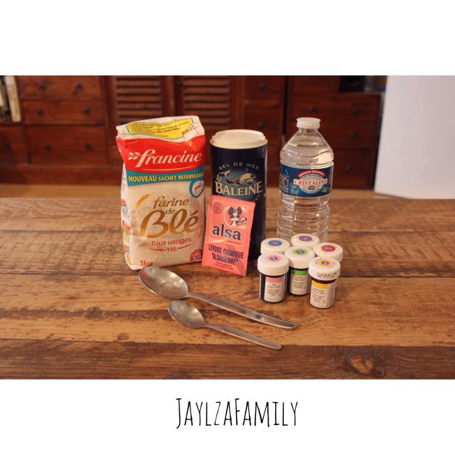 Fastoche, tu touilles la farine, le sel, l’eau et la levure. Ensuite si tu veux plusieurs couleurs, tu répartis la pâte (qui devra être crémeuse) dans différents récipients puis tu ajoutes les colorants.