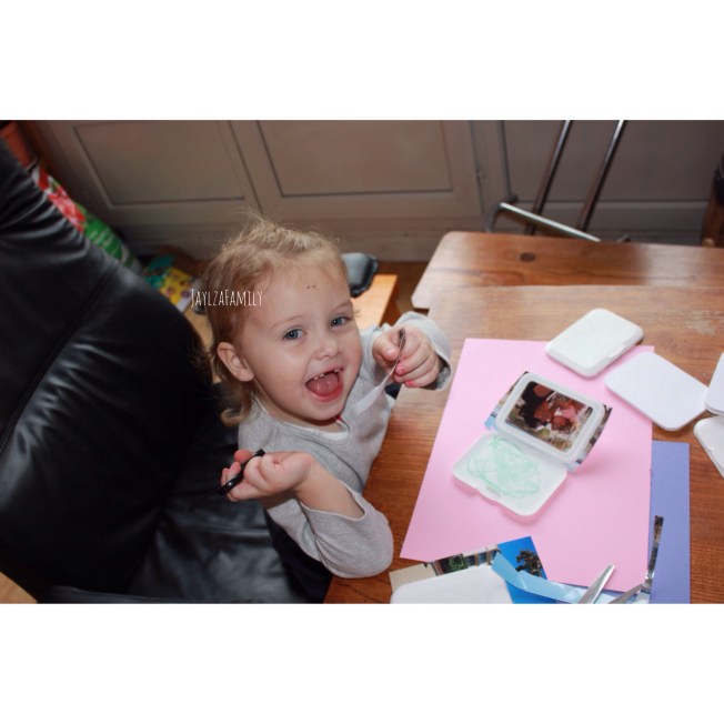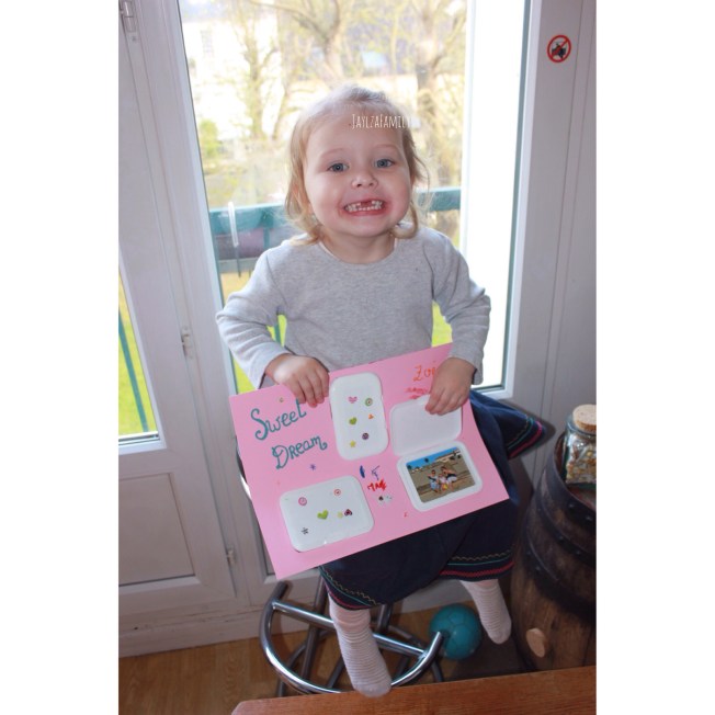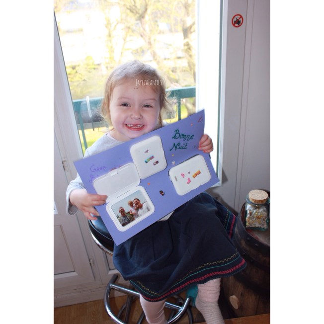 Et ce qu’on n’avait pas fait, était de lui laisser une photo de nous dans le lit! (Un basique!) Après avoir réparé notre erreur, nous avons pensé que ce serait encore plus chouette d’avoir des photos de la famille juste au dessus de sa tête, sur une feuille cartonnée, cachées par des couvercles de lingettes. *Là tu es en mode « J’ai rien compris! »*