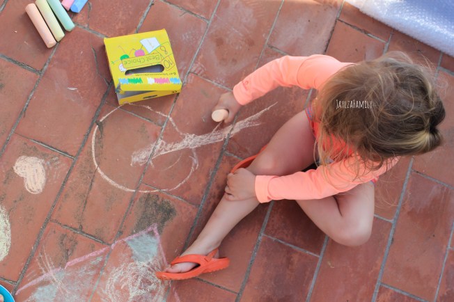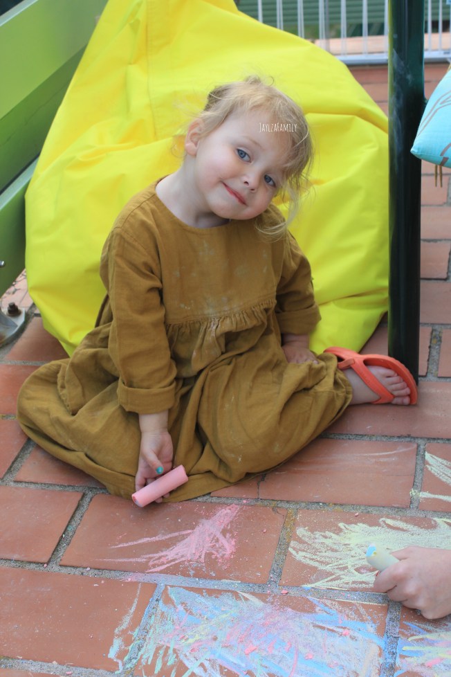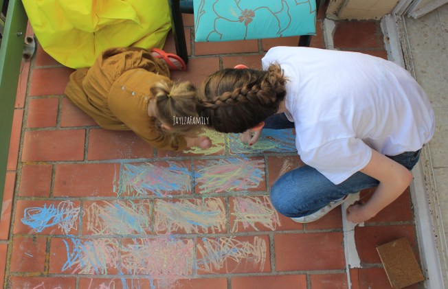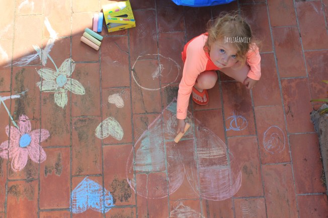 L’activité la plus simple du monde : un sol et des grosses craies! Le tour est joué. Budget minimal pour réussite maximale!