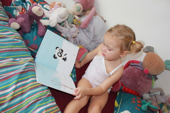 Nous avons trouvé un nouveau livre sur le thème du sommeil, un peu rigolo, j’ai peur que ça ne la stimule plus qu’il n’en faut, mais on verra! On en reparlera rapidement!