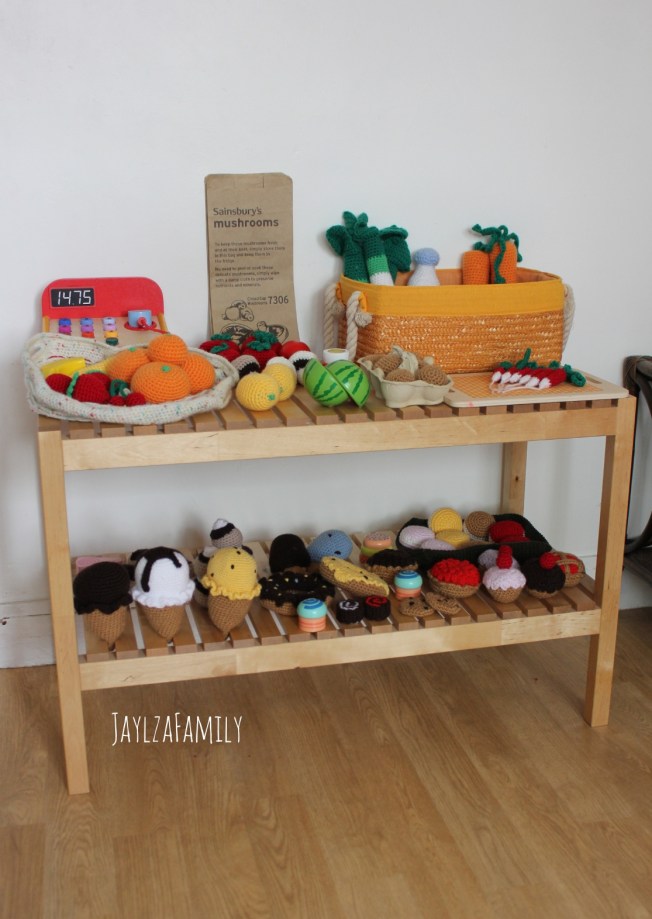 On n’aime moins la place que ça prend… L’air de rien, les fruits, les légumes, les pâtisseries, etc. (Oui, parce qu’il y a aussi un kit docteur, des peluches et poupées… Bref on a de quoi faire!), ça encombre la chambre et le salon! Un deuxième point « négatif », les poils de chat ou les cheveux s’y agrippent…