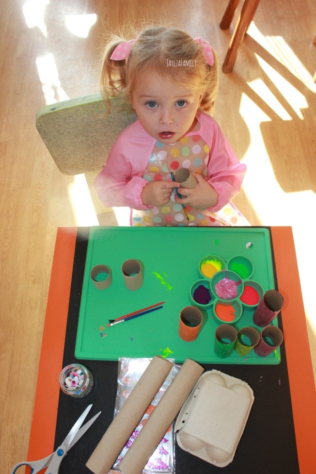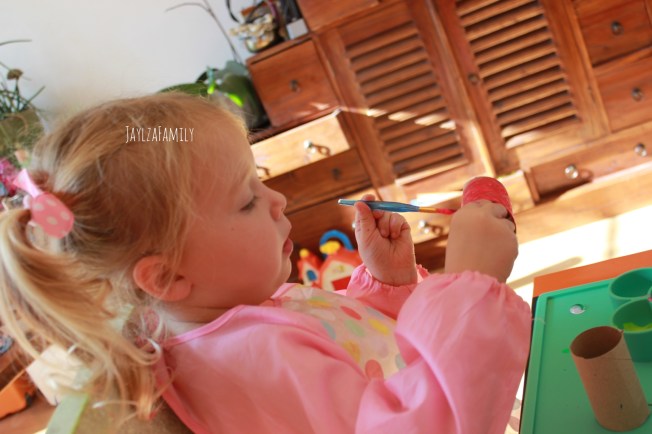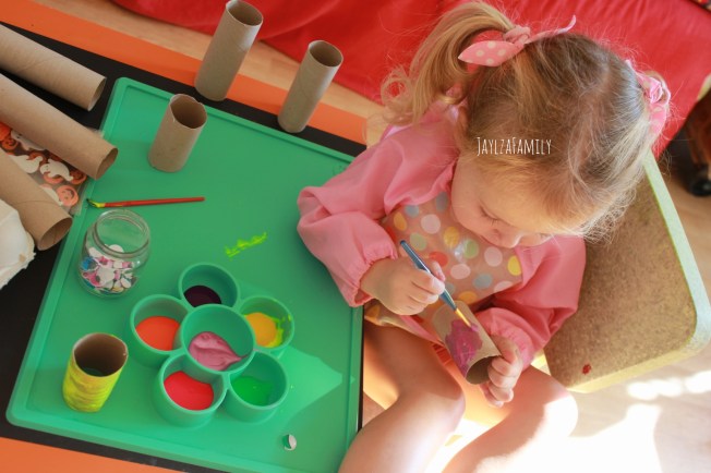 Après avoir coupé en 2 ou 3 les rouleaux (vides hein, j’ai pas précisé, mais va pas me mettre du papier partout oh! 😂), tu les peins, ou plutôt tu laisses ton enfant mettre la peinture dessus, et tu pries pour qu’il n’y en ait pas par terre!)