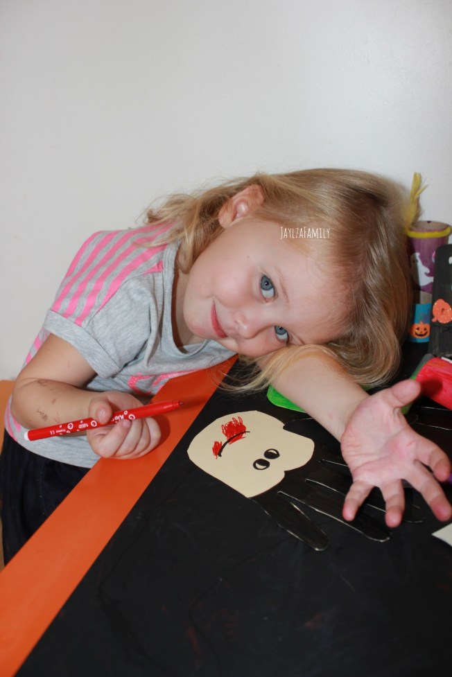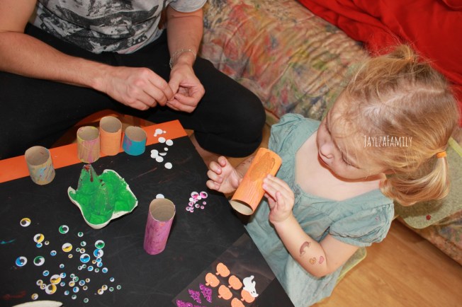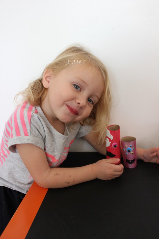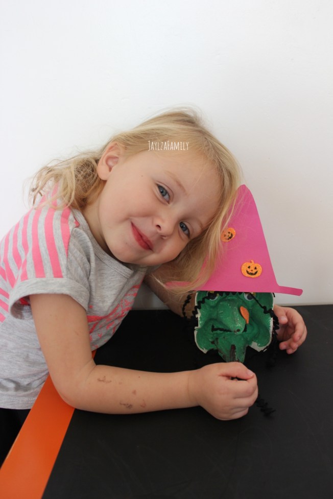 Tu coupes la boîte en 2, et tu ne gardes que 2 rangées. Tu peins, tu colles les yeux, des cheveux, un chapeau rose… (Enfin ici c’est rose, tu te doutes que c’est Tchoupine qui a choisi, mais tu prends la couleur que tu préfères!) Et en guise de poireau, tu noteras qu’elle a mis une citrouille à paillettes! 😂😅