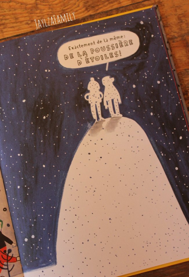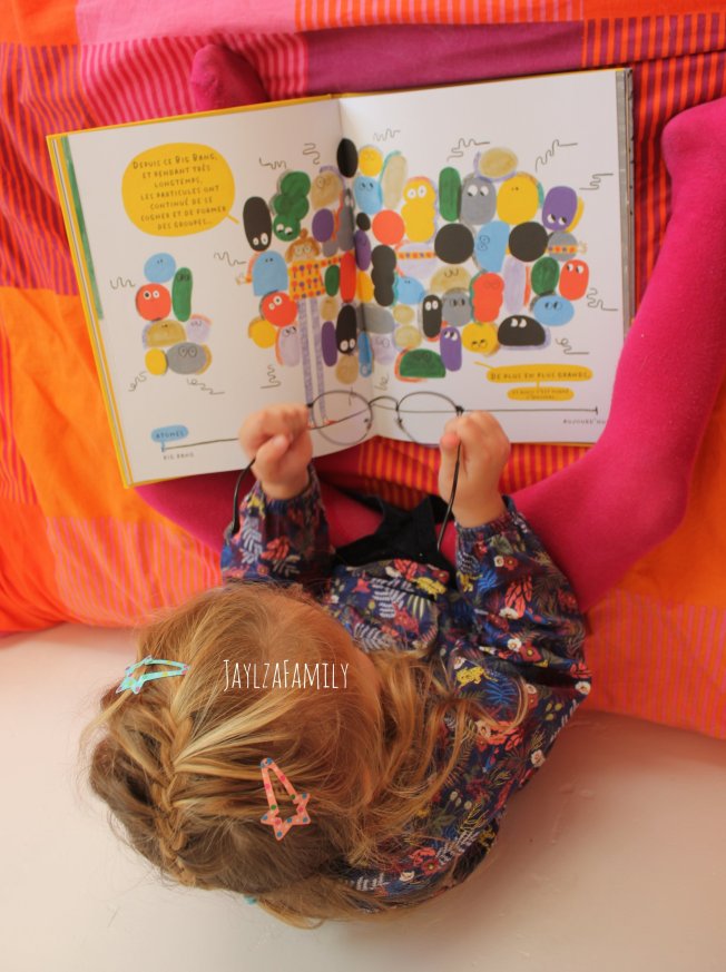 En ce qui concerne l’histoire, c’est exactement le résumé, une vulgarisation de la création de l’Univers. 40 pages qui ramènent toujours au réel et à notre place dans l’univers, avec des exemples très parlants, une frise chronologique et des détails documentés.