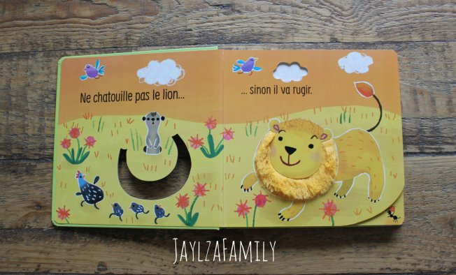 Ne chatouille pas le lion! Tu risques de le faire rugir… Les tout-petits ne résisteront pas au plaisir de chatouiller les différentes matières pour entendre le son produit par chaque animal. À la fin du livre, c’est une vraie cacophonie!