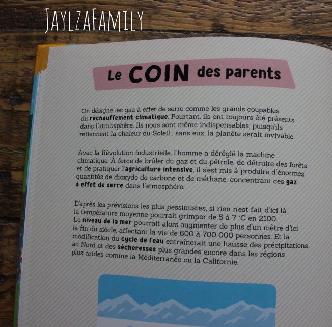 Enfin, le coin des parents, une page pour remettre un peu les idées en place, ne pas oublier que notre planète est fragile et que c’est maintenant qu’il faut la protéger.