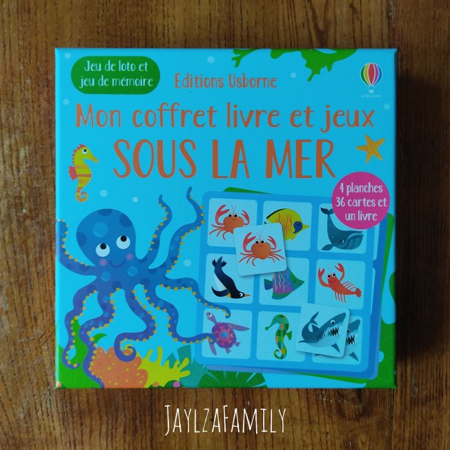 Les enfants trouveront dans ce coffret quatre planches de loto avec 36 petites cartes représentant des animaux marins pour jouer à un jeu de mémoire et un jeu de loto ainsi qu’un petit livre illustré de 12 pages contenant les règles du jeu et des explications sur chaque animal.