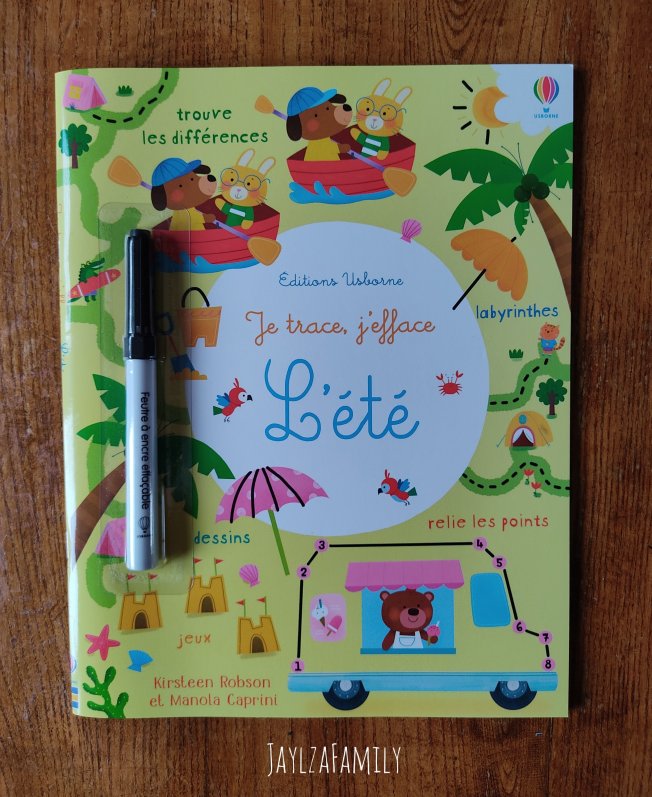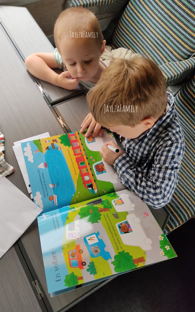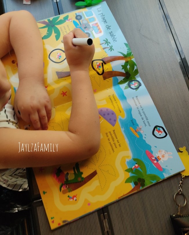 Ce livre est parfait pour les 3-5 ans (et même les 2 ans pour grabouiller!) L’avantage est que même si on se trompe, on efface et on recommence. Il faut bien sûr penser à prendre un petit chiffon pour effacer, sinon les mains ça marche aussi, mais c’est vite noir…!