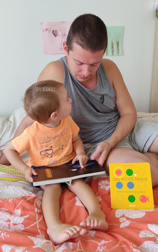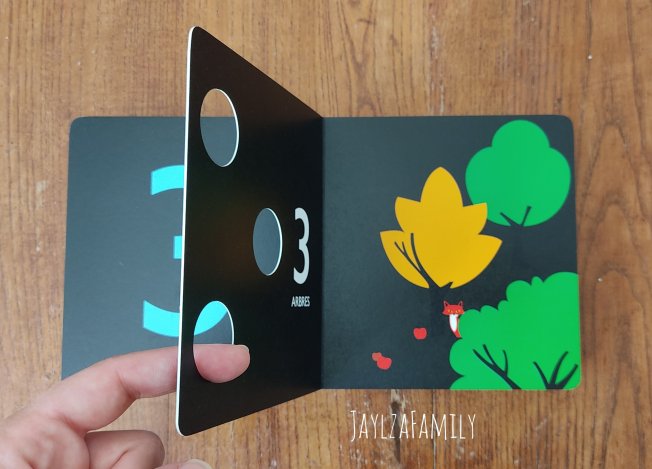 Notre avis : Ce livre cartonné d’un format adapté aux petites mains (15×14) est plus qu’attrayant pour les enfants. Je ne m’attendais pas à un fond noir, mais les couleurs vives sont de fait mises en valeur. Le côté ludique qui a beaucoup plu à lOulOu : les trous (autant de trous que le nombre que l’on découvre!) sur chaque page. « J’fais des trous, des p’tits trous, toujours des p’tits trous » (J’vois pas pourquoi je serais là seule à l’avoir en tête!)