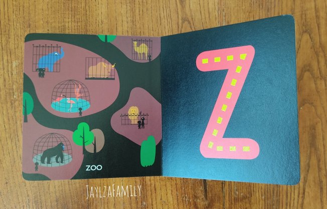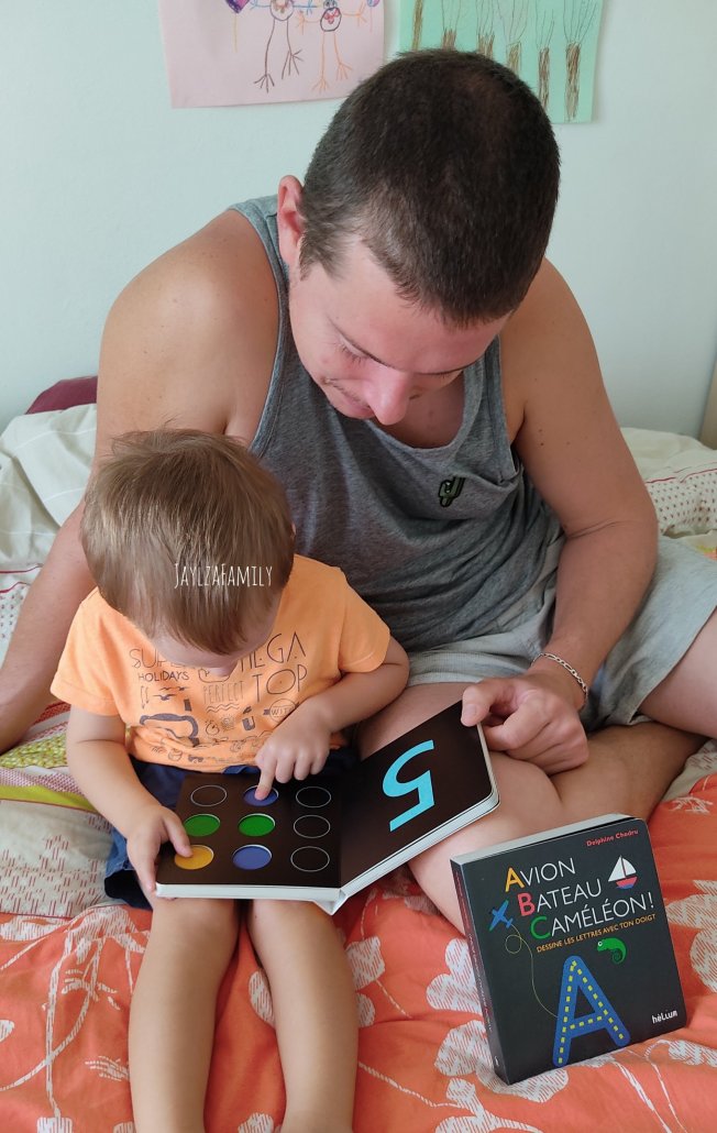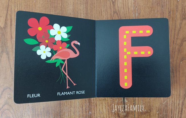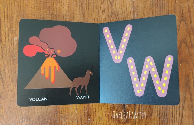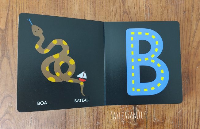 Notre avis : Tout comme son copain des petits trous, ce livre cartonné de plus de 40 pages est résistant et adapté aux plus petits grâce à ses bords arrondis. Chaque double page présente une ou deux lettres (à droite), illustrée par plusieurs dessins (à gauche). Encore une fois, le fond noir surprend, mais c’est pour mieux faire ressortir les lettres. Lettres ornées de tirets jaunes en relief, ce que lOulOu a particulièrement apprécié. Certains animaux proposés pour représenter les lettres ne sont pas des plus courants, ce qui permet de faire de nouvelles découvertes!
