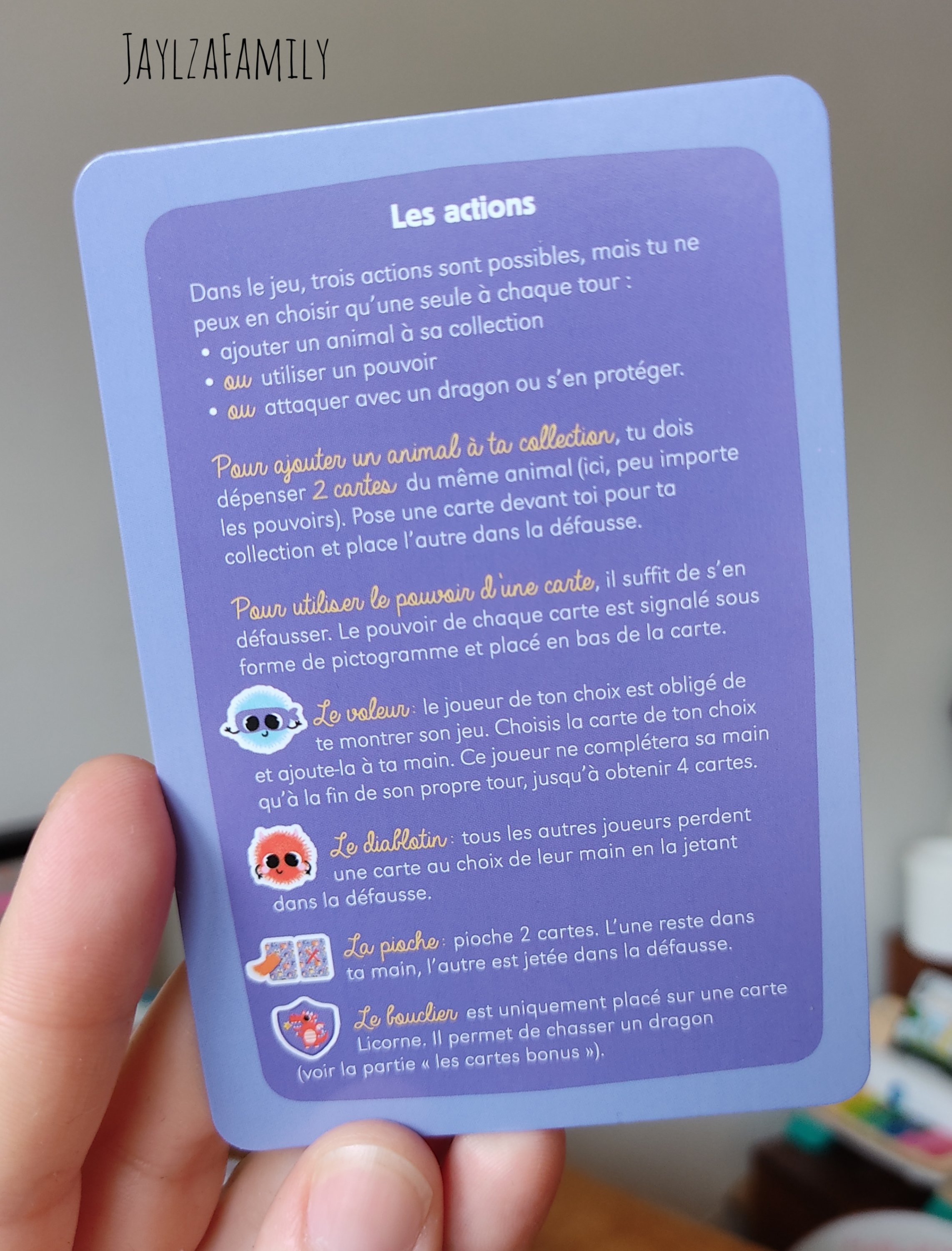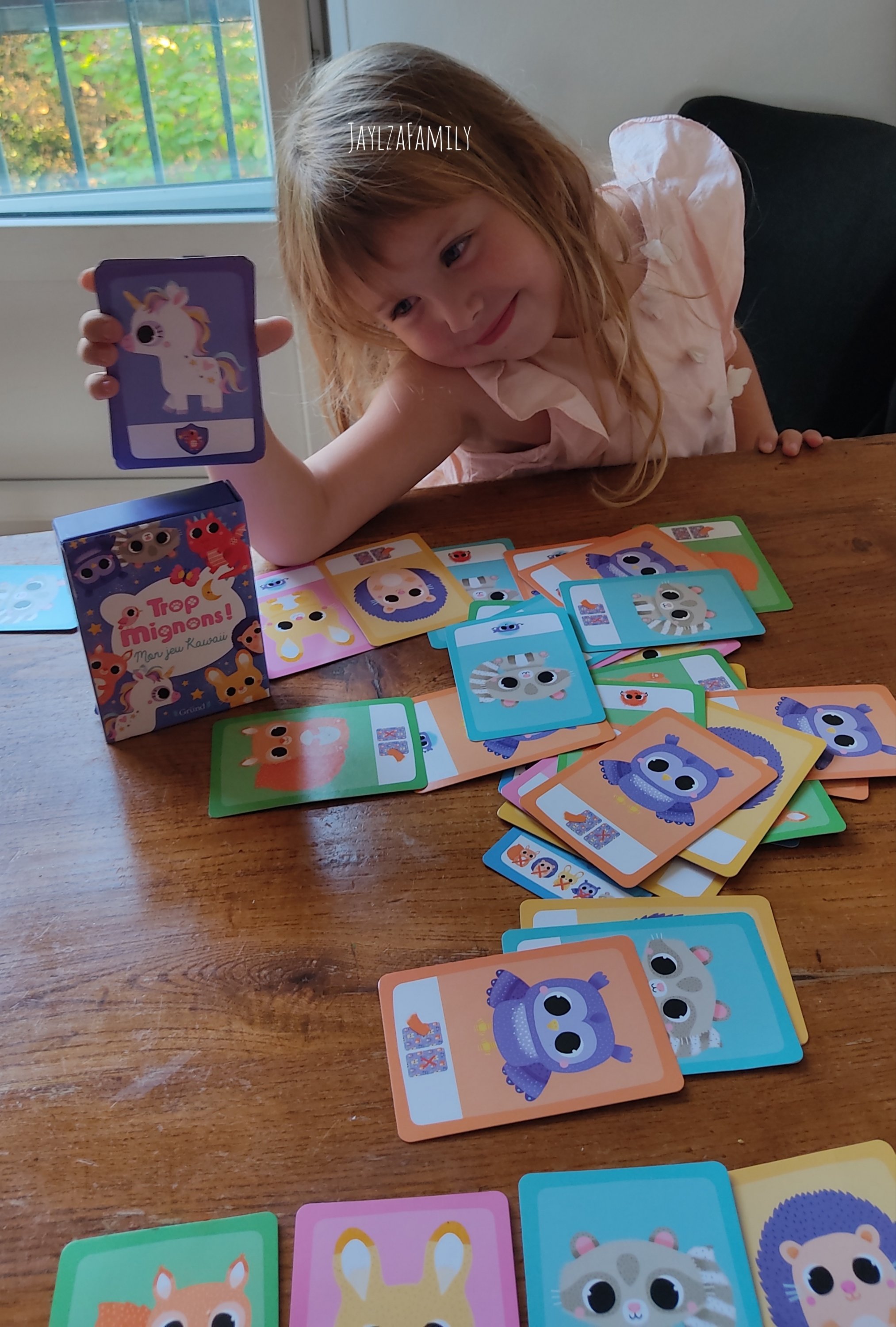 Concernant notre avis, on peut dire que ce jeu est validé par Tchoupine. Bien évidemment, lOulOu est trop jeune pour suivre toutes les règles, mais Tchoupine du haut de ses 5 ans et demi les a bien intégrées (même si on est d’accord qu’elle aimerait avoir un carré de licornes, ce qui ne sert pas plus que ça pour remporter une partie!!!) Il n’y a pas d’écriture sur les cartes, uniquement des dessins.