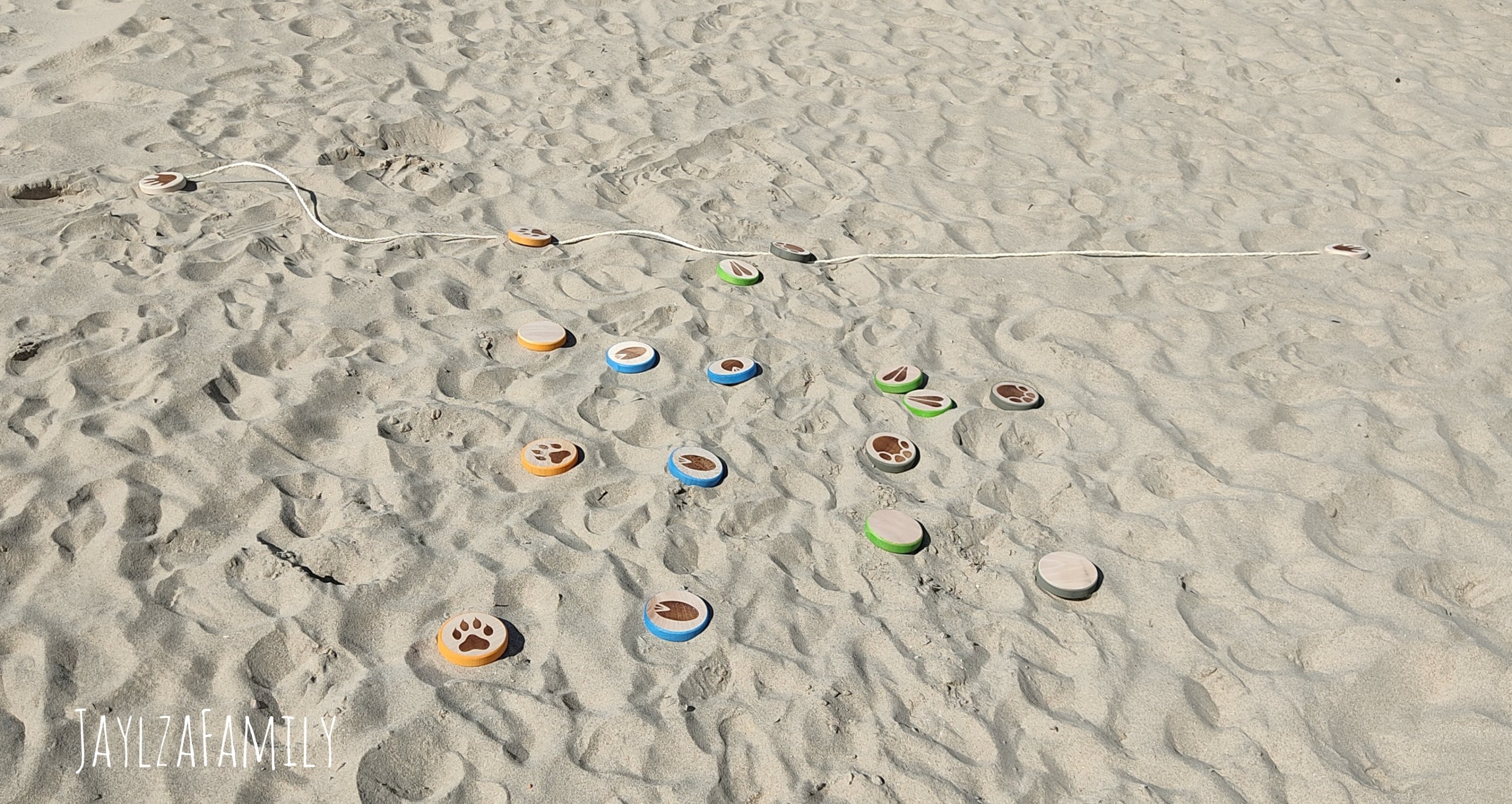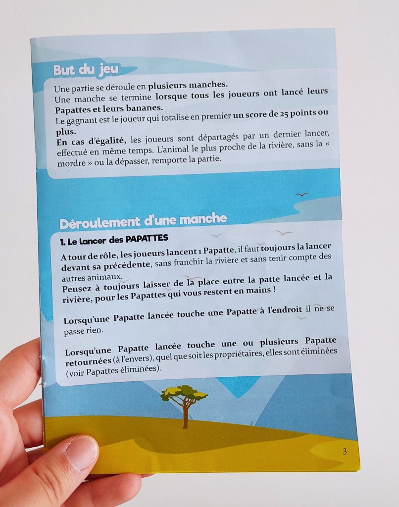 La partie se déroule en plusieurs manches. À tour de rôle, les joueurs (de 2 à 4, mais en vrai tu peux faire des équipes doubles), lancent un palet (en platane issu de forêts éco-gérées et peint à l’eau 😎) en direction de la rivière, représentée par la corde. Comme chaque palet symbolise les 4 pattes des animaux, le but est de lancer la papatte plus près de la rivière que la précédente (Pour représenter son avancée). Attention quand même à ne pas tomber dans l’eau, les crocodiles rôdent.
