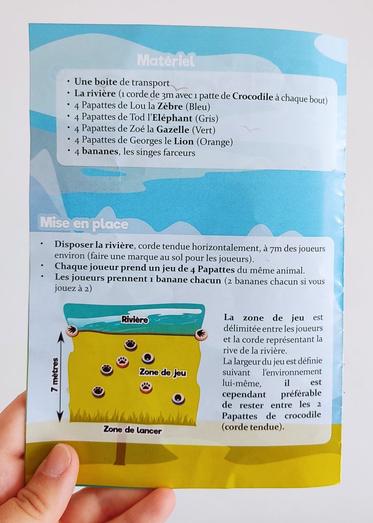 Le matos : Une boîte de transport en bois, 1 corde de 3m pour représenter la rivière avec une patte de crocodile à chaque bout, 4 papattes de Lou la Zèbre, 4 papattes de Tod l’Éléphant, 4 papattes de Zoé la Gazelle, 4 papattes de Georges le Lion, 4 bananes des singes farceurs.