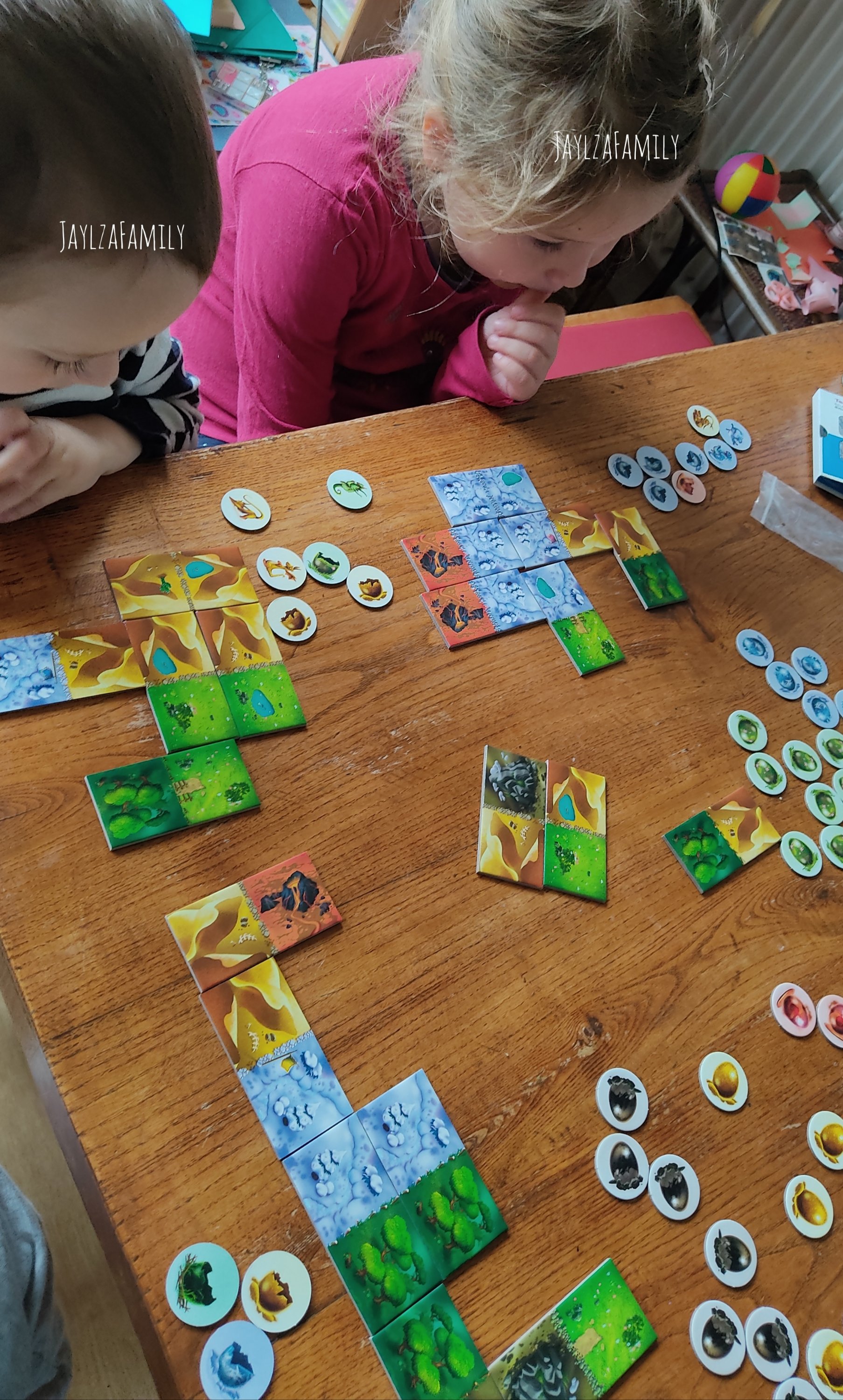 Enfin, dans le non suivi de règles, on a décidé de ne faire coïncider que des dominos ayant le même paysage (S’il n’existe pas de possibilités pour obtenir un œuf, nous ne piochons aucun domino. Dans les règles, on prend quand même un domino et on le place n’importe où, mais ça embrouillait la tête des enfants^^)