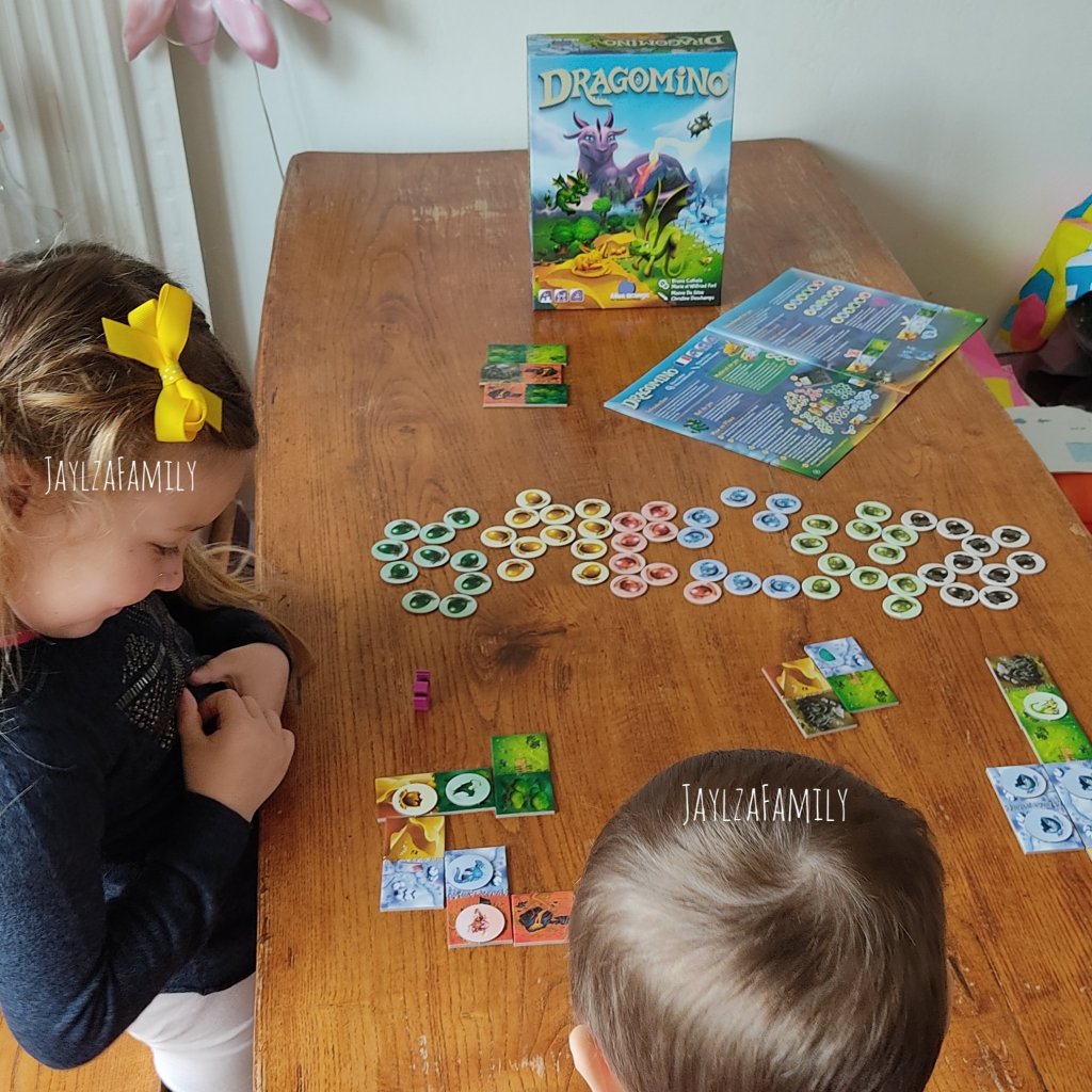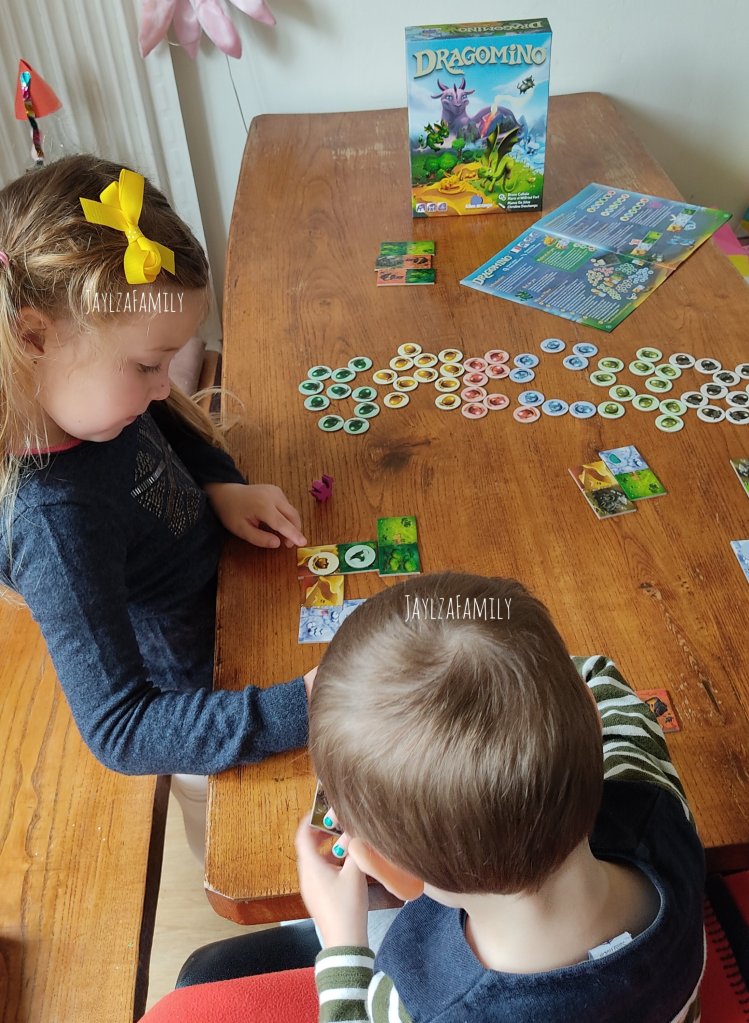 Notre avis : Premièrement, les enfants ont été plus qu’emballés par l’univers dragonesque du jeu! Zoé connaissait déjà le principe des dominos, Basile moins bien.