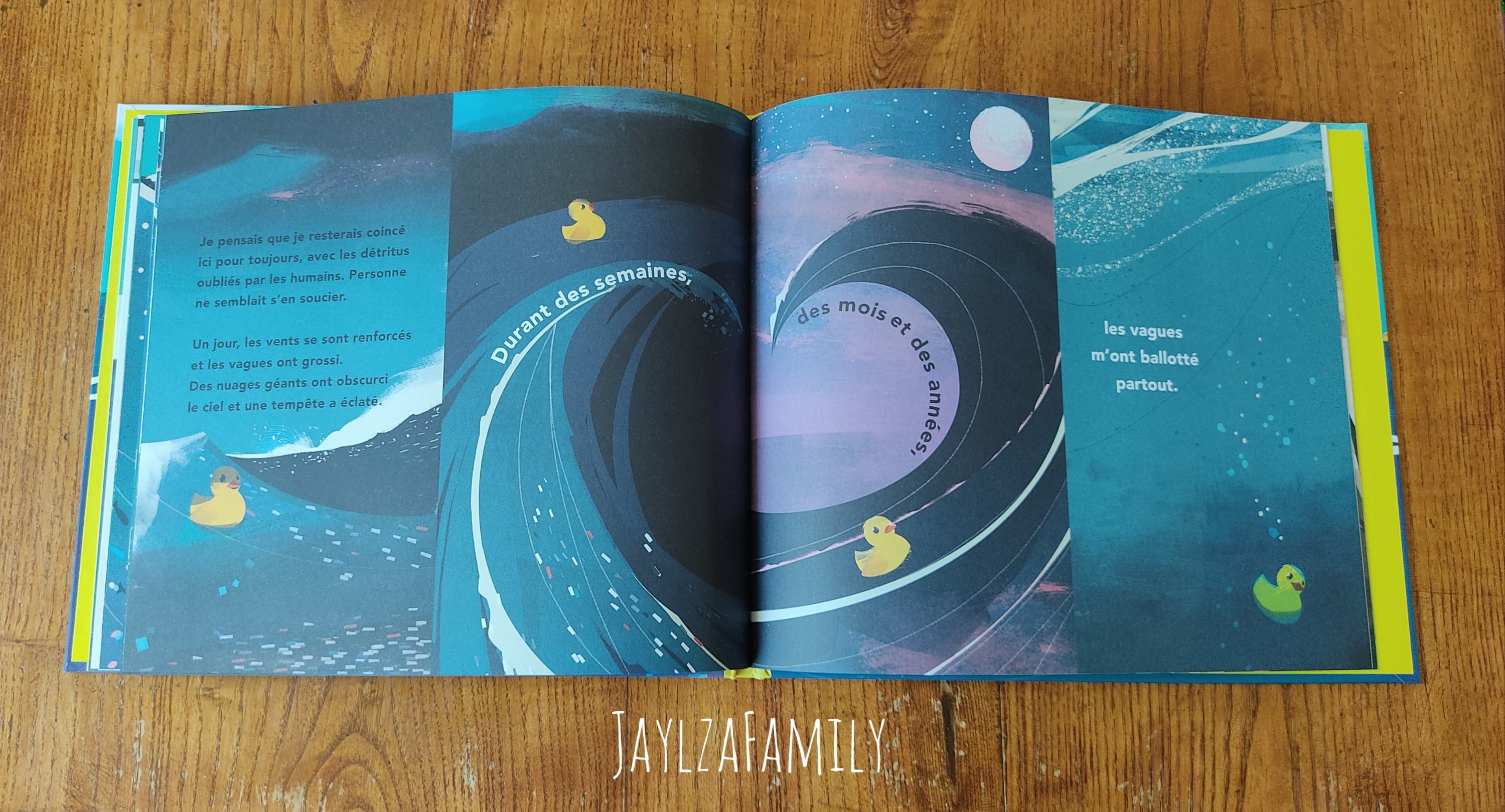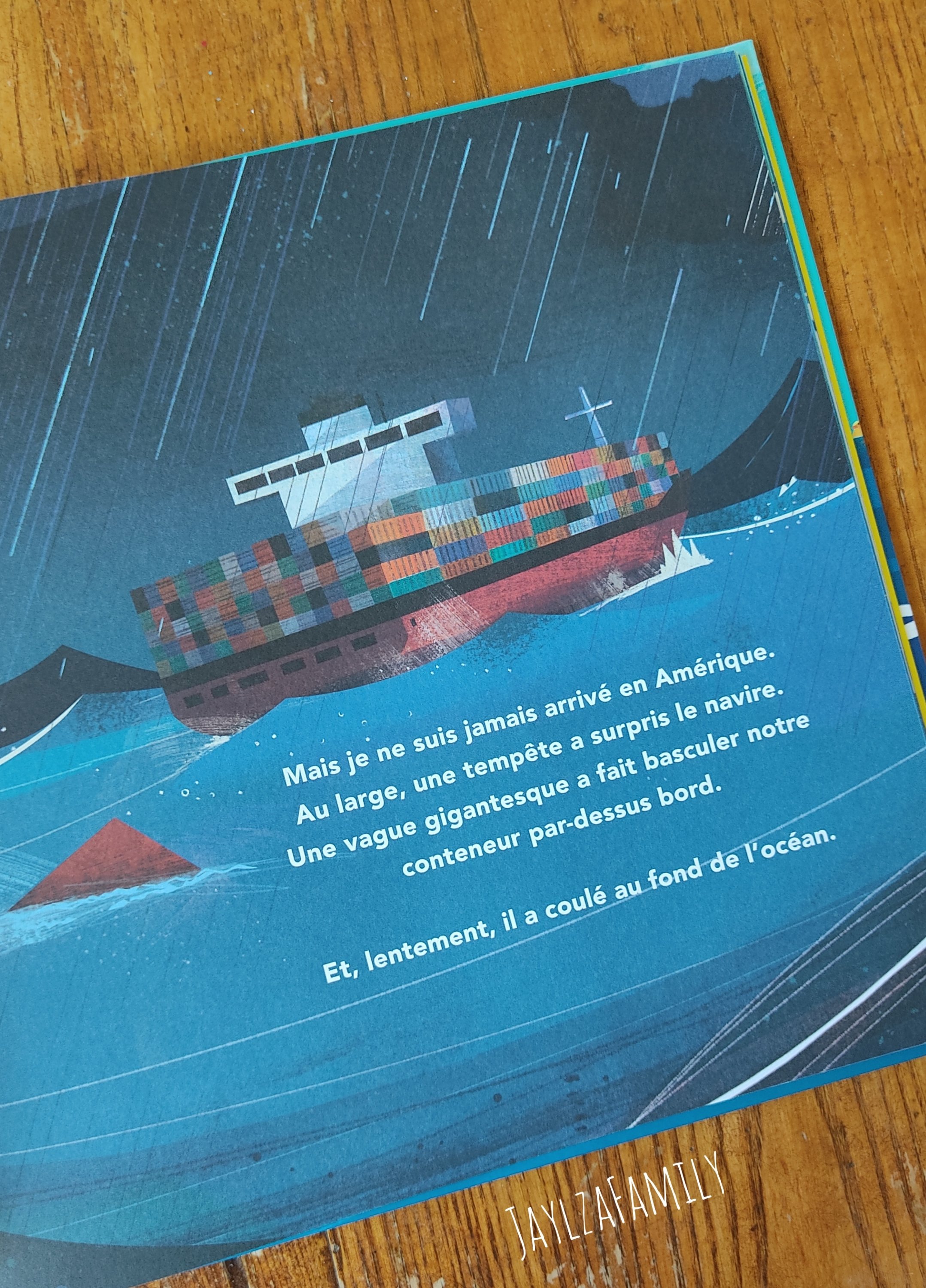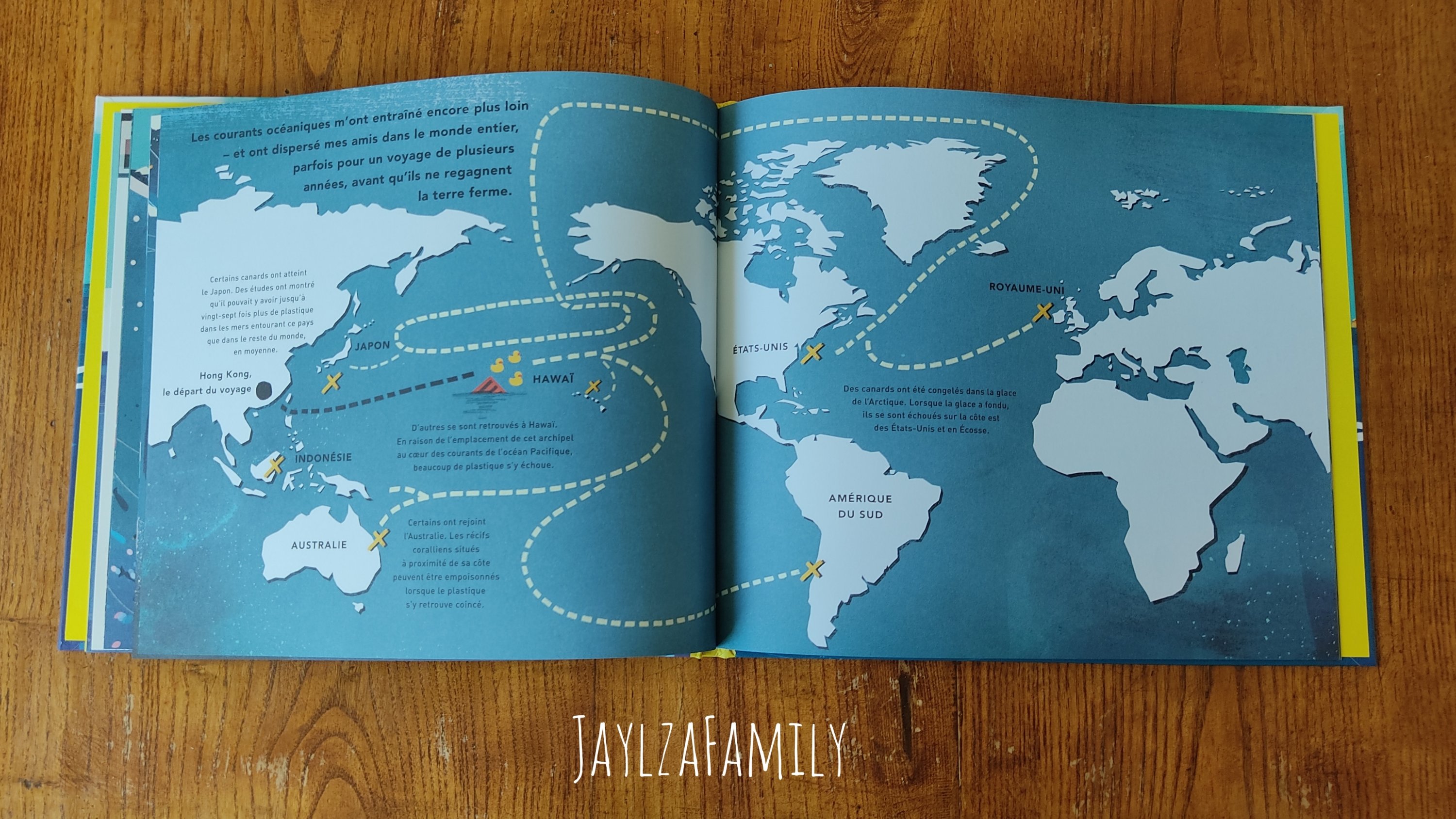 « Grâce » à cet événement indésirable, les chercheurs ont pu déterminer les courants marins. Certains parcourront plus de 27000 kilomètres! Alaska, Europe, Hawaï, on retrouvera ces jouets un peu partout aux larges des côtés. Nous retrouvons d’ailleurs quelques données scientifiques en fin de livre, ce qui vient parfaitement compléter cette histoire. On fait un rappel sur l’écologie et l’environnement aux enfants, tout en apprenant de nouvelles informations. Ce livre devrait être dans toutes les classes d’école!