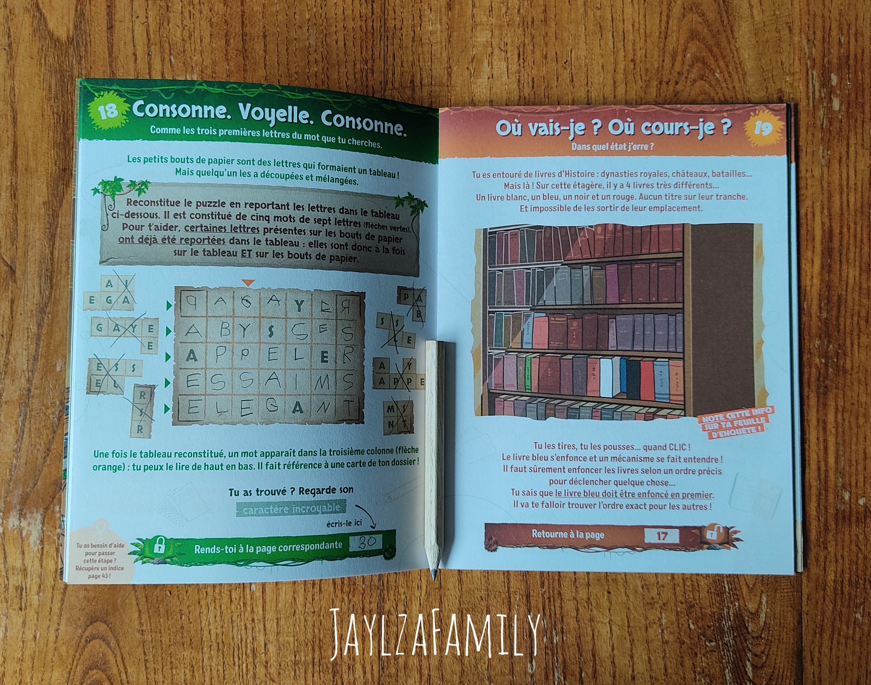 Les livrets m’ont fait penser aux livres dont on est le héros (Si tu es vieux, tu connais, sinon, demande à tes parents! 🤪), puisqu’une fois une énigme résolue, on doit se rendre à une autre page avant ou après, selon où l’on se trouve. Cette dynamique permet à l’enfant d’être toujours en alerte. (Et c’est plus fun que de tourner les pages dans l’ordre tout simplement!)