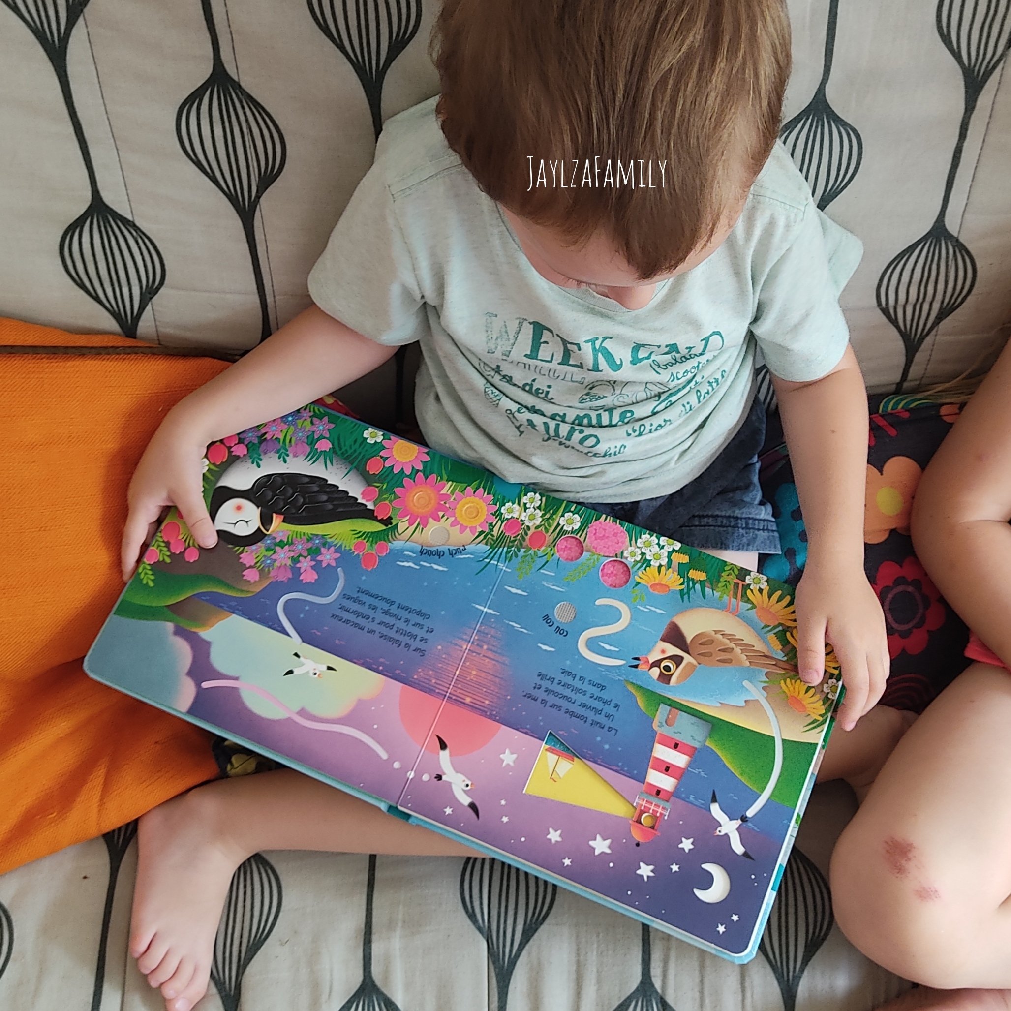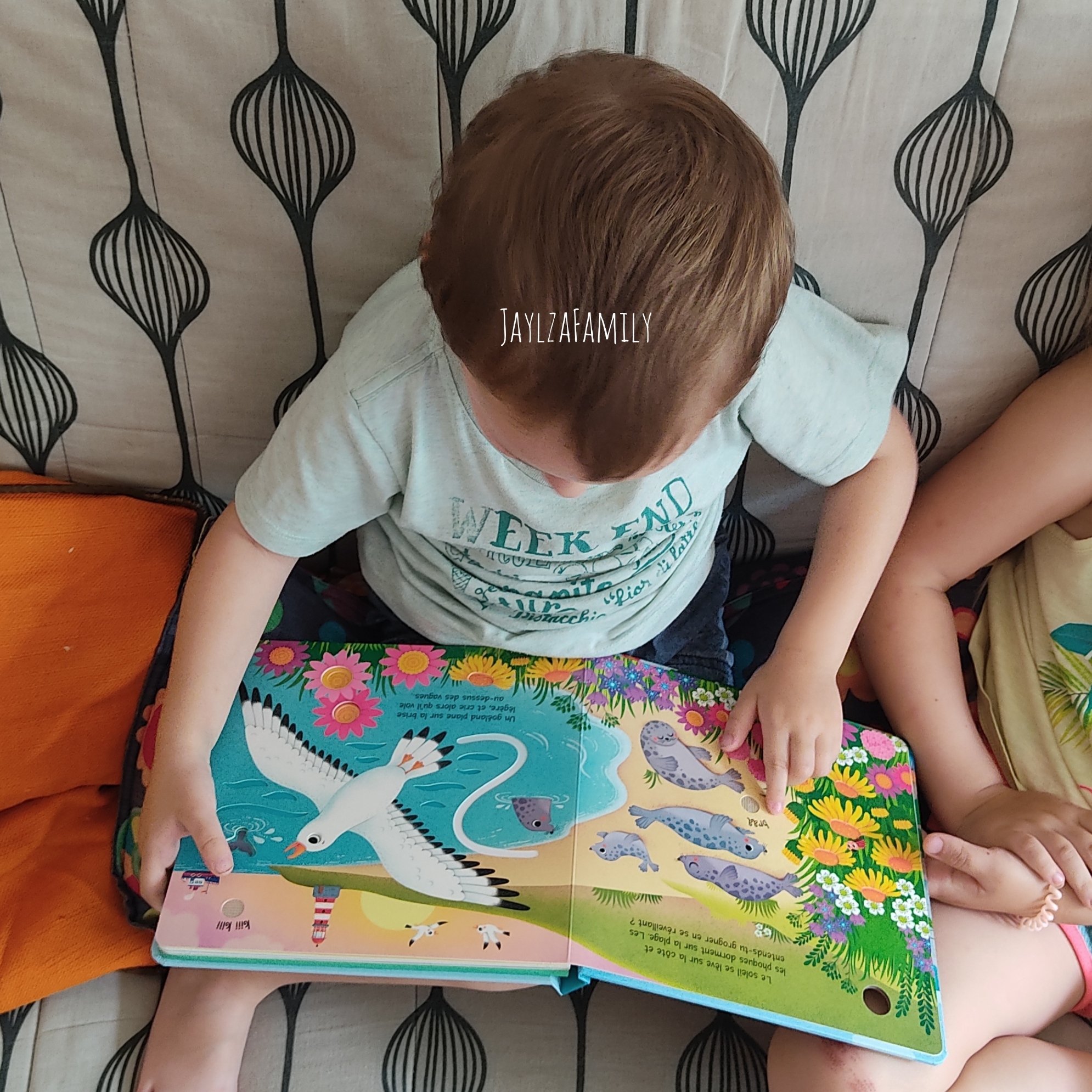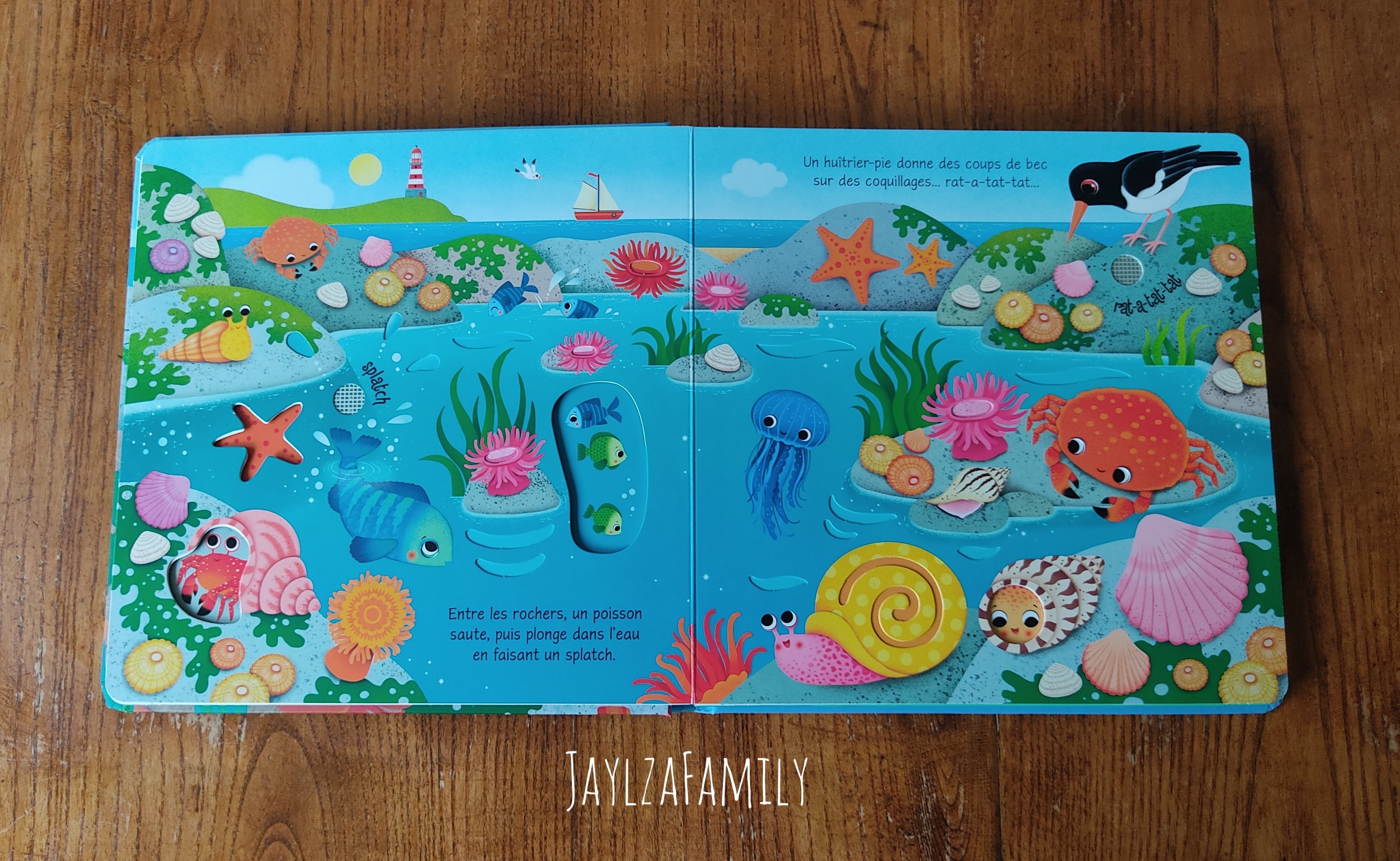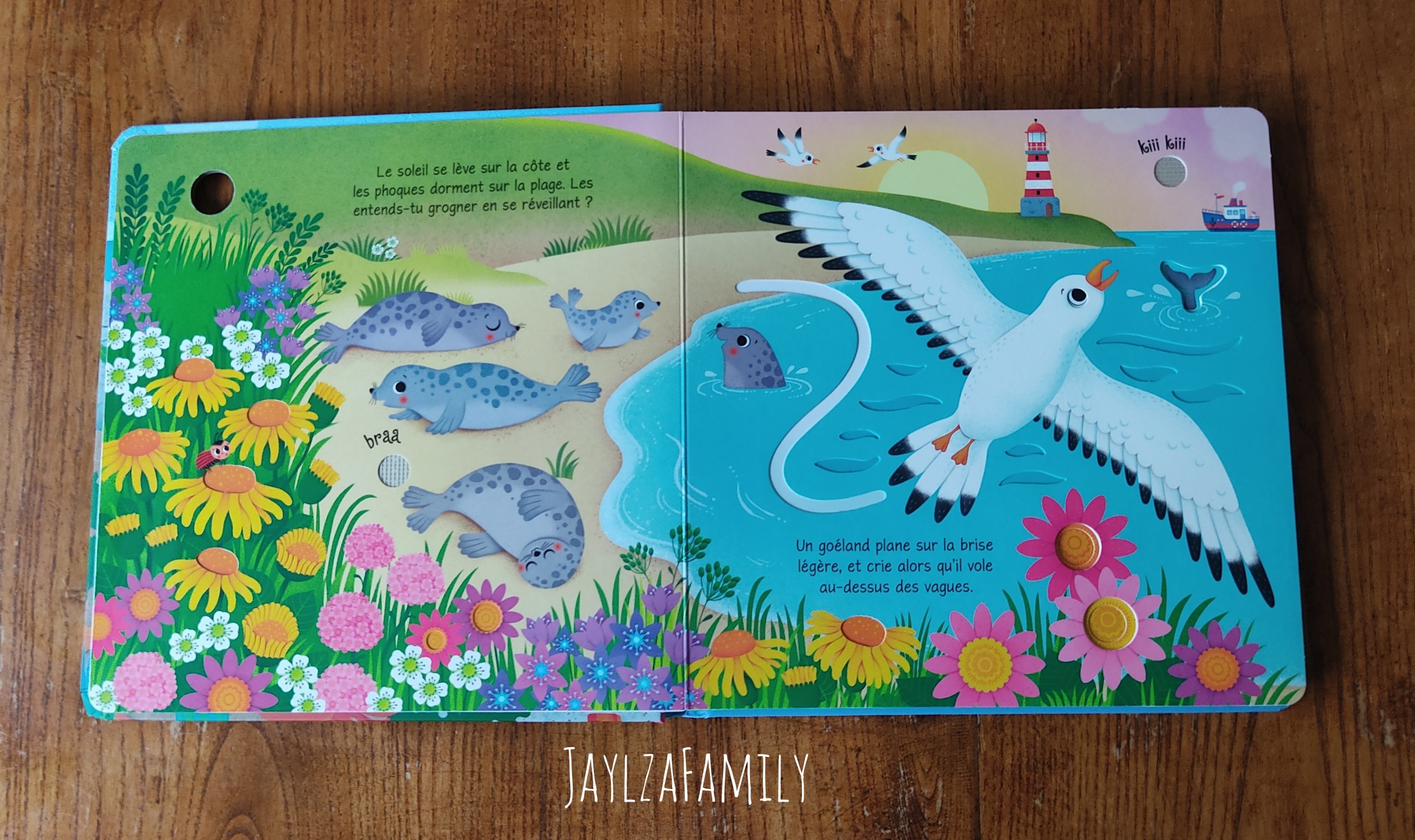 Notre avis : Un album coloré à souhait, pour (re)découvrir la mer et ses sons à travers les animaux et les éléments qui l’entourent. On aime que ce livre soit sonore mais également à toucher avec des reliefs (et des trous!) qui permettent des effets visuels très sympas.