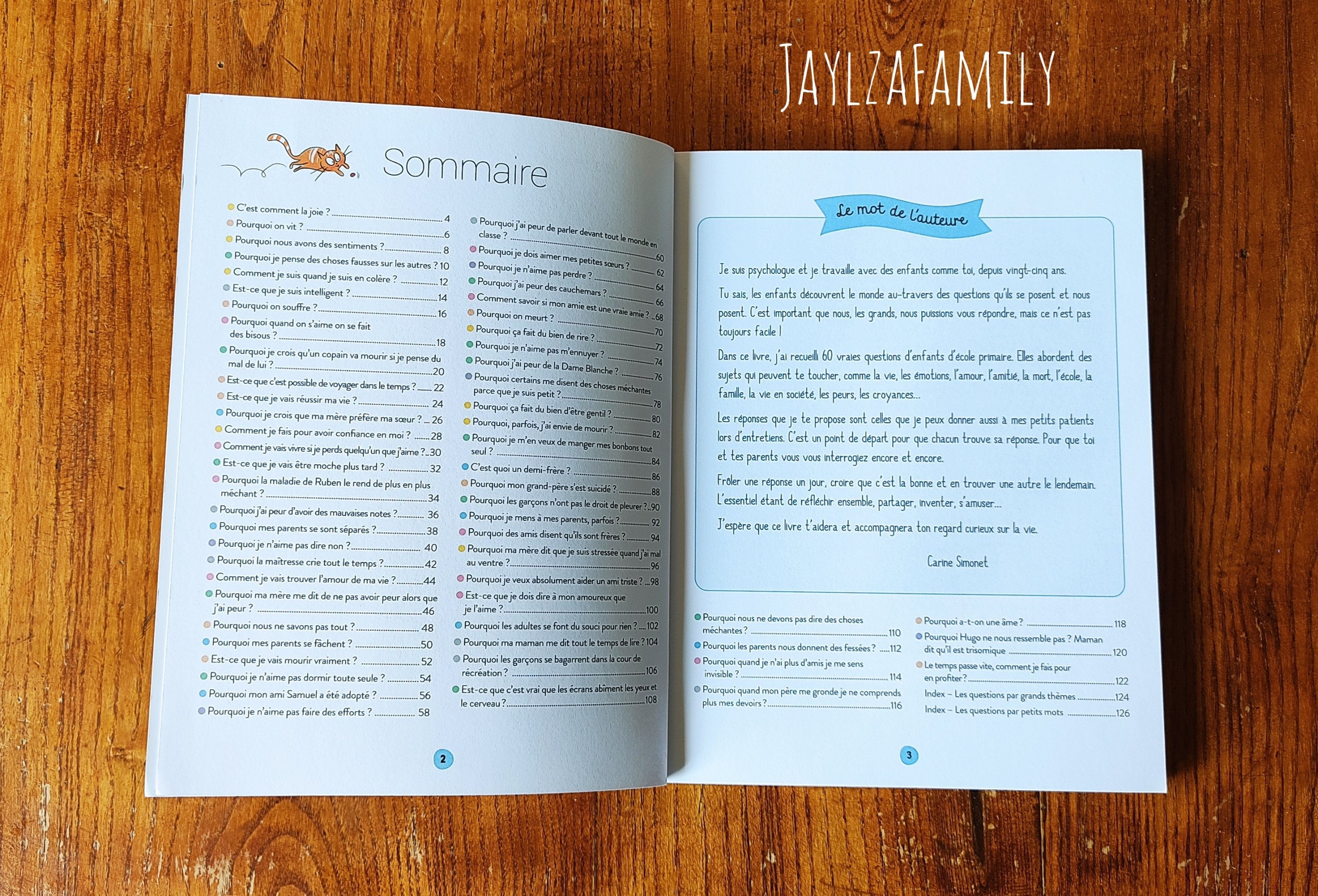 Le résumé : Les enfants découvrent le monde et grandissent au travers des questions qu’ils se posent. L’ouvrage est un recueil de 60 grandes questions existentielles d’enfants de classe de primaire et début collège, et les réponses sérieuses ou plus anecdotiques de la psychologue-auteur, pour dédramatiser.