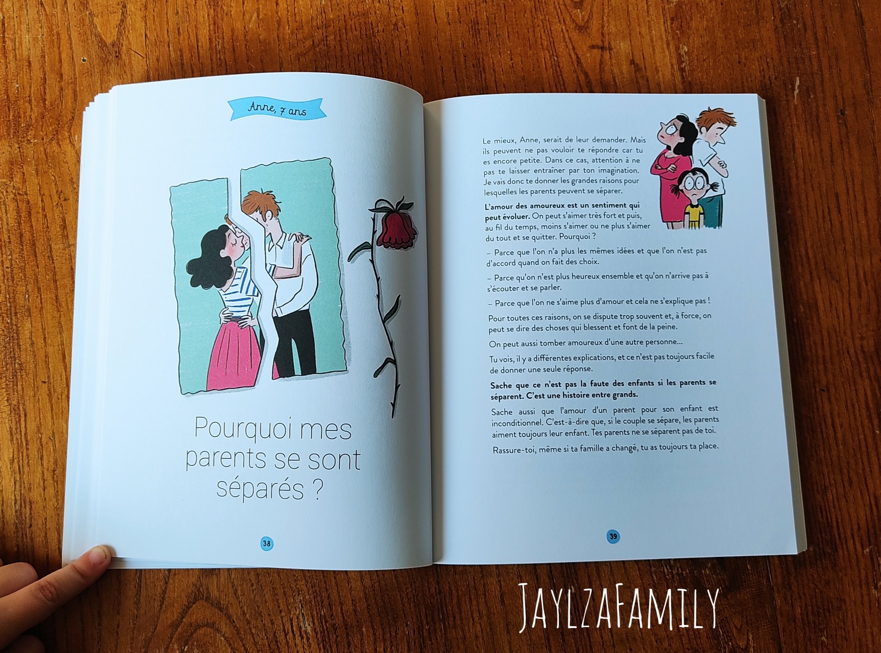 Ce livre ne se lit pas comme une histoire, on le feuillette, on prend le thème qui nous intéresse, puis on lit la question posée par un enfant. L’intérêt réel est que les mots employés sont simples, et destinés aux enfants. La réponse est faite à l’enfant qui pose la question, le tutoiement est utilisé. Les illustrations sont très jolies, pleines d’humour et permettent ainsi d’égayer certains thèmes lourds.
