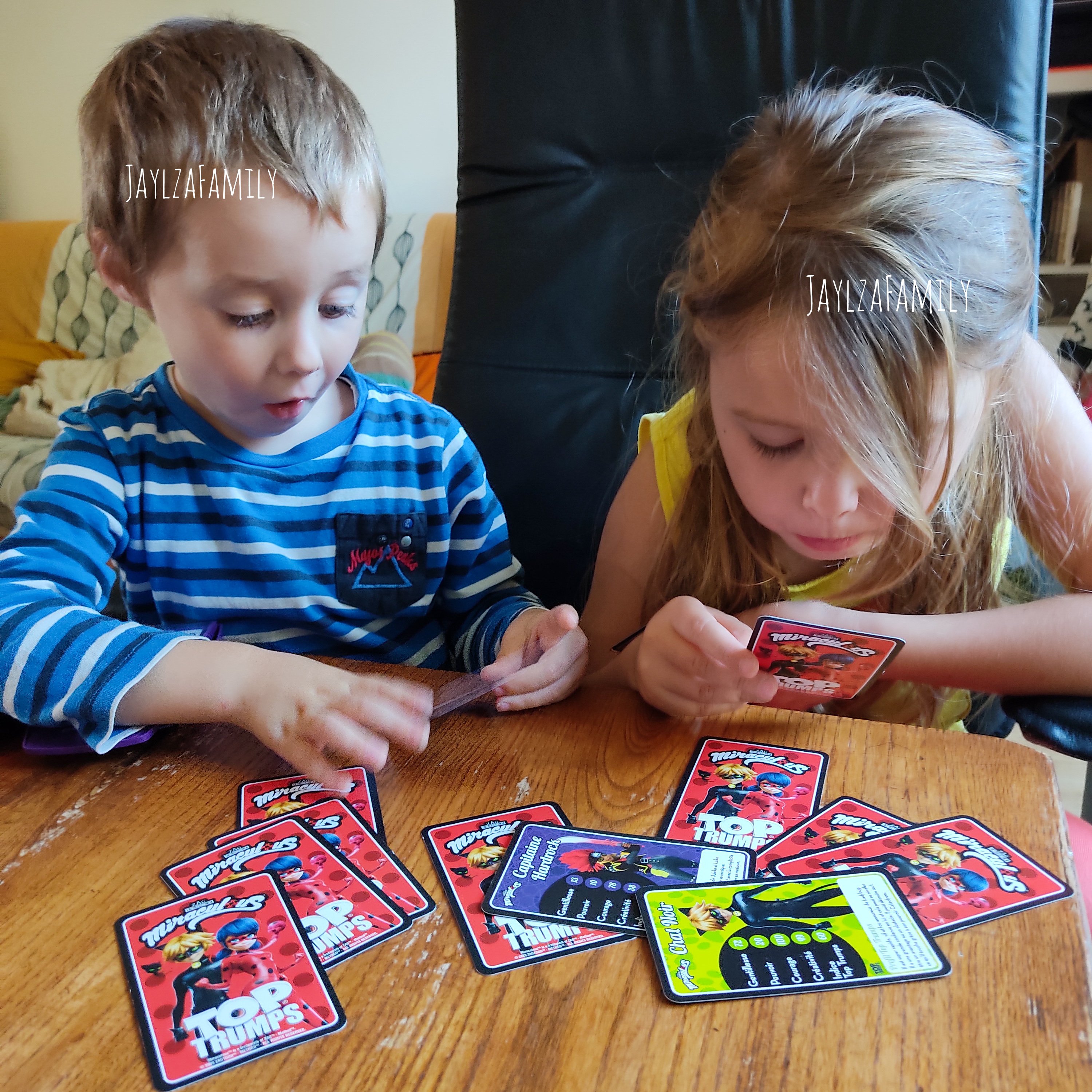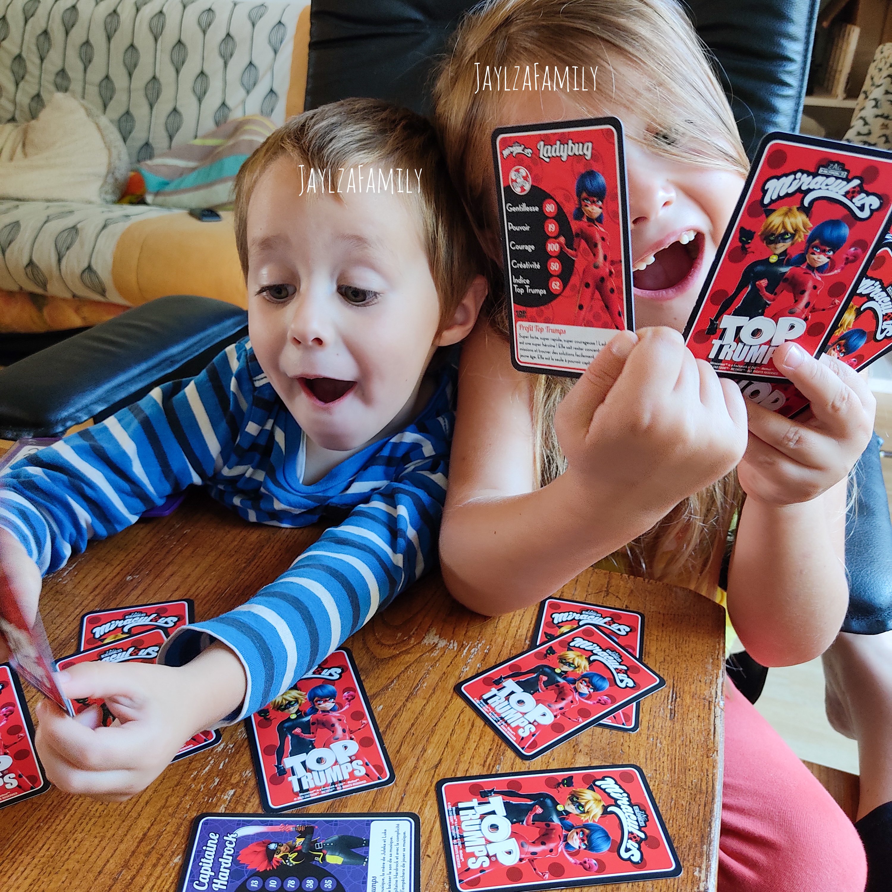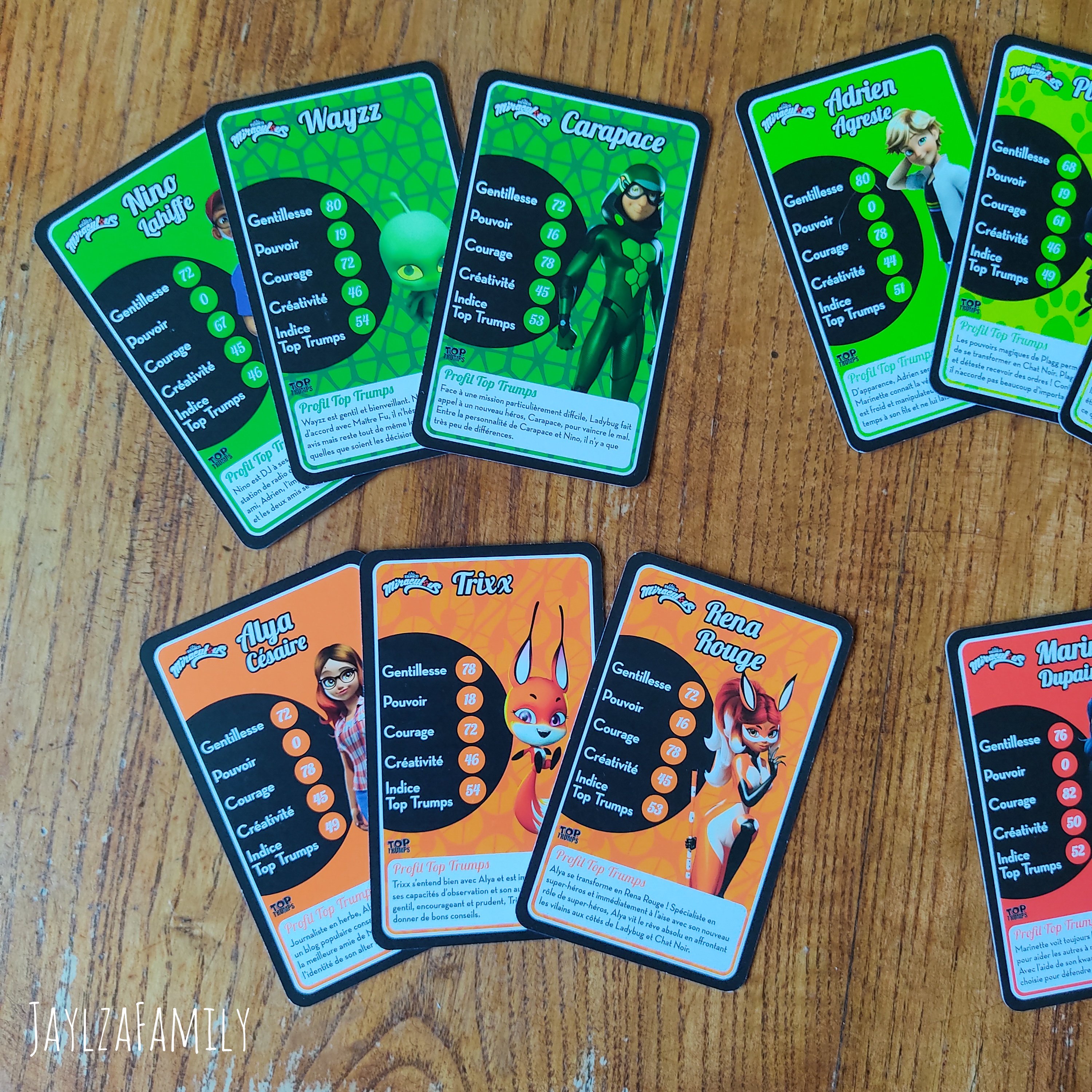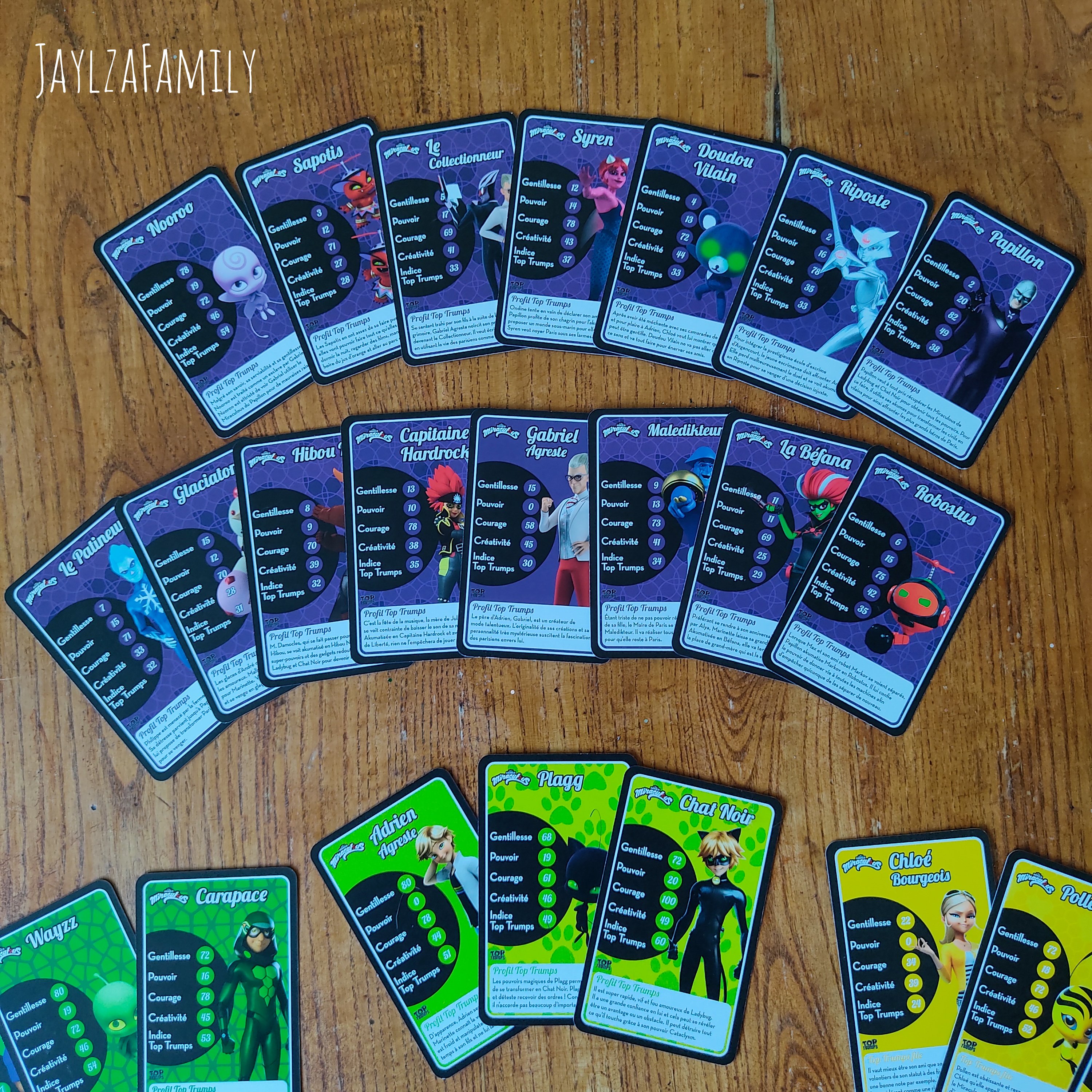 Chaque jeu est composé de 30 cartes. Dans le jeu Miraculous, le plus haut score est 100 (pour le courage de Lady Bug et Chat Noir!) Parmi les autres caractéristiques, on retrouve la gentillesse, le pouvoir, le courage, la créativité et l’indice Top Trumps. Chaque carte est accompagnée d’une phrase courte décrivant le personnage représenté.