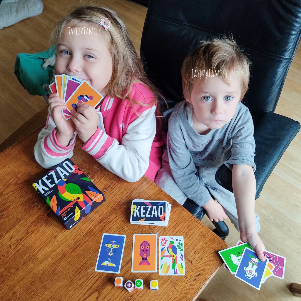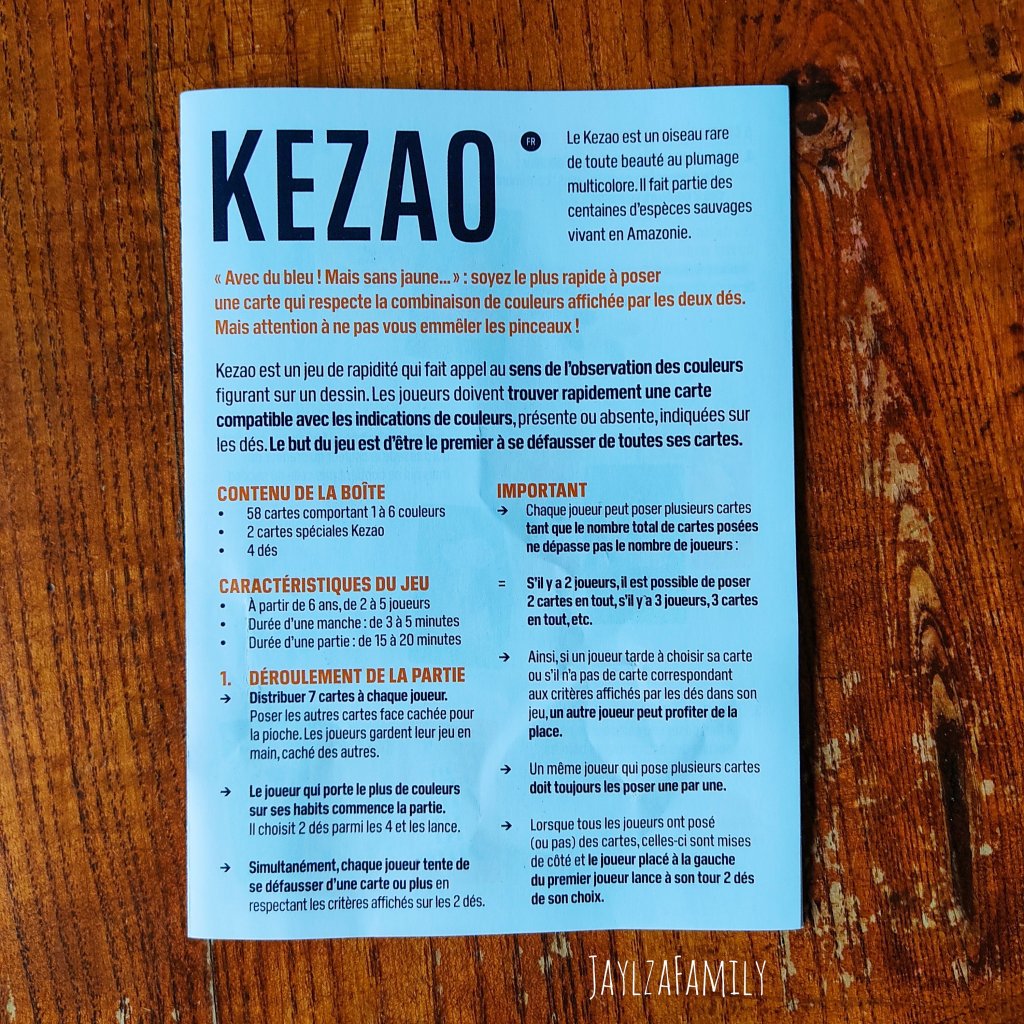 KEZAO est un jeu de rapidité qui fait appel au sens de l’observation des couleurs figurant sur un dessin. Les joueurs doivent trouver dans leur jeu une carte compatible avec les indications de couleurs, présentes ou absentes, indiquées sur les dés. Le but du jeu est d’être le premier à se défausser de toutes ses cartes.