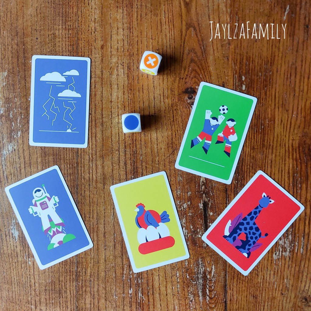 Quand les dés sont lancés, il faut être assez rapides pour repérer les cartes correspondant aux couleurs énoncées, que ce soit la couleur en fond ou celles du dessin, en sachant qu’on peut défausser plusieurs cartes lors du même tour, sans dépasser le nombre de joueurs présents. (À 3 joueurs, si l’un défausse 3 cartes, les autres ne peuvent pas jouer même s’ils avaient des cartes correspondantes.) Si un joueur se trompe, il reprend sa carte et en pioche 3 nouvelles (et toc!).