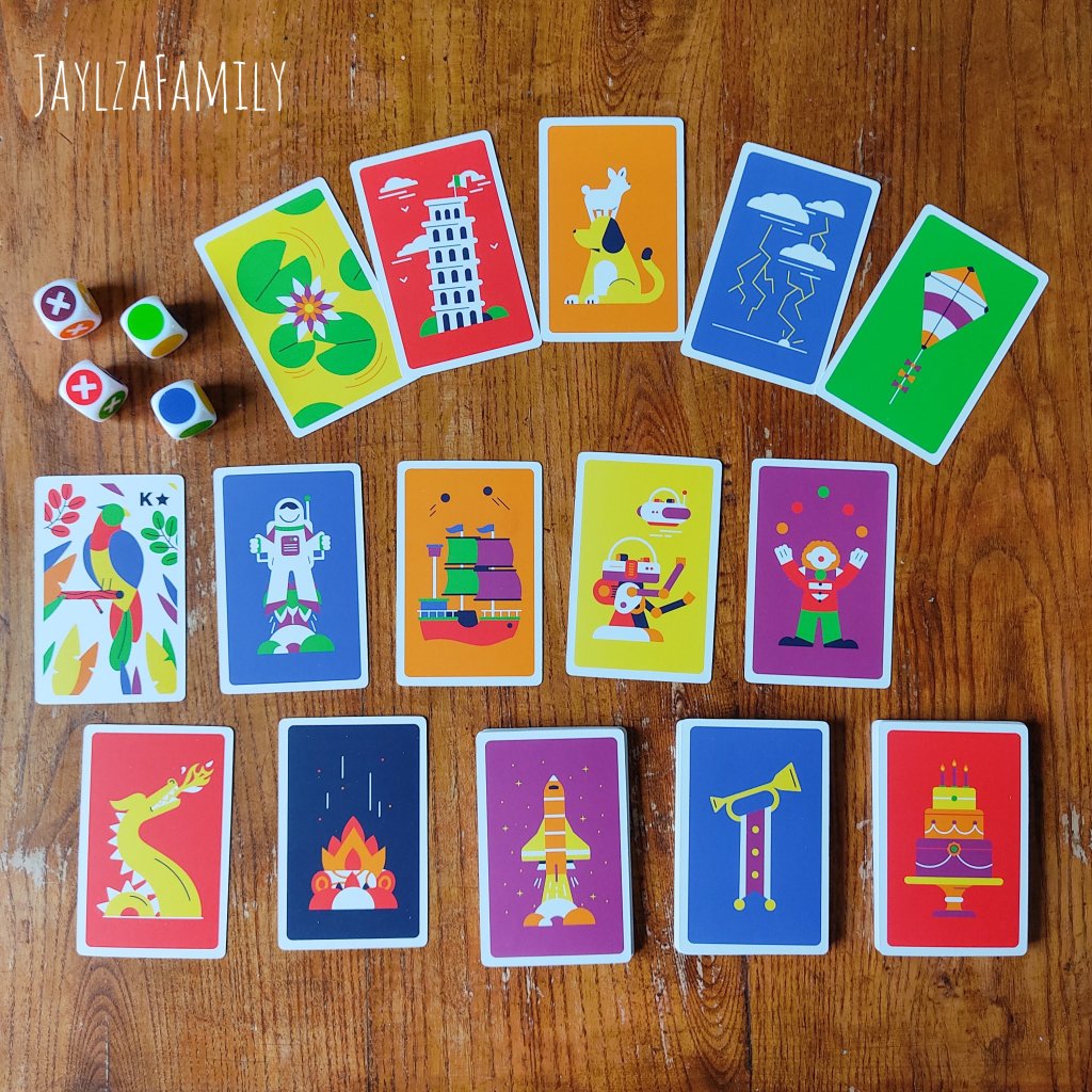 La boîte se compose de 60 cartes (illustrées par Aurélien Jeanney) dont 2 cartes joker (celle avec l’oiseau) qui peuvent être jouer à n’importe quel moment, 4 dés et une règle du jeu.