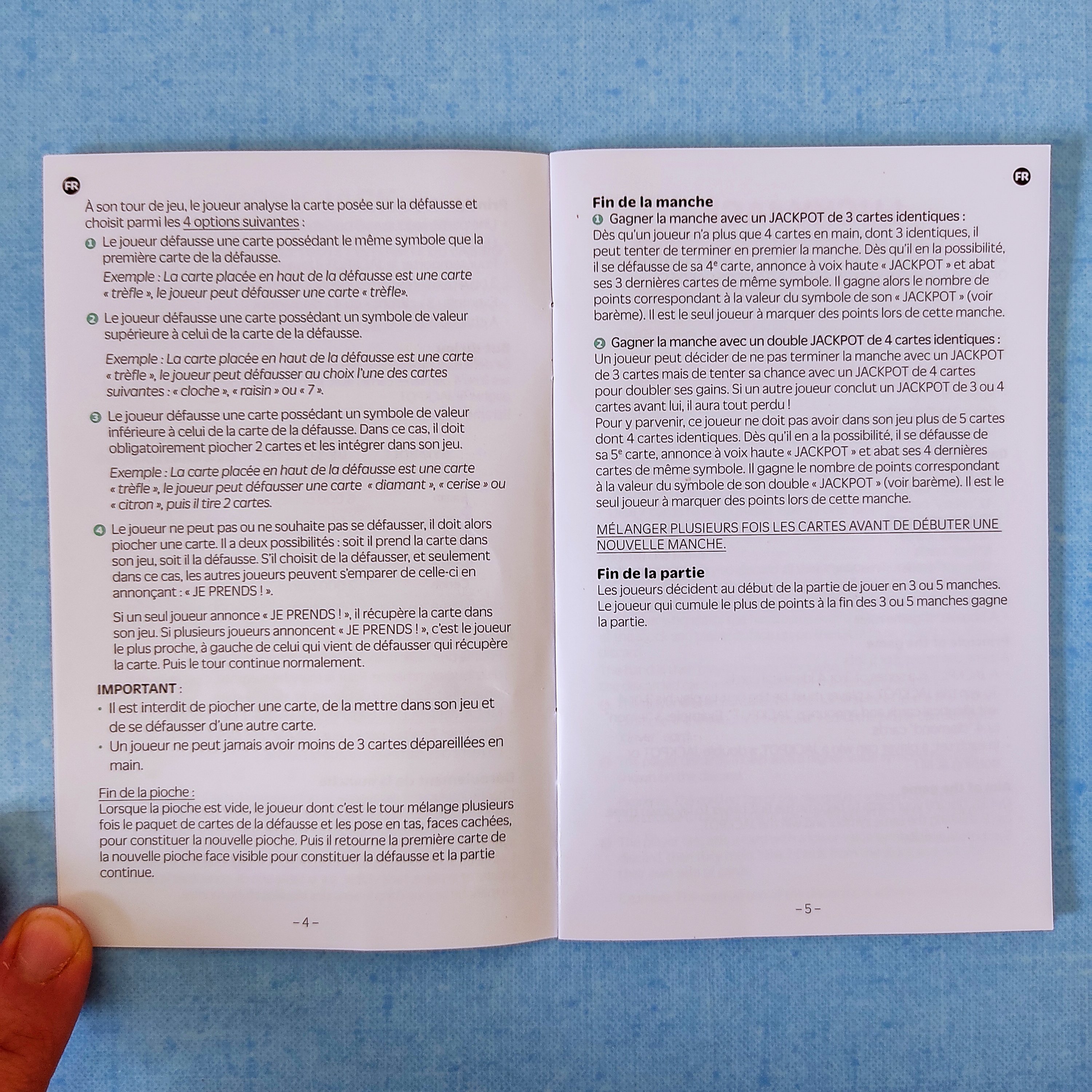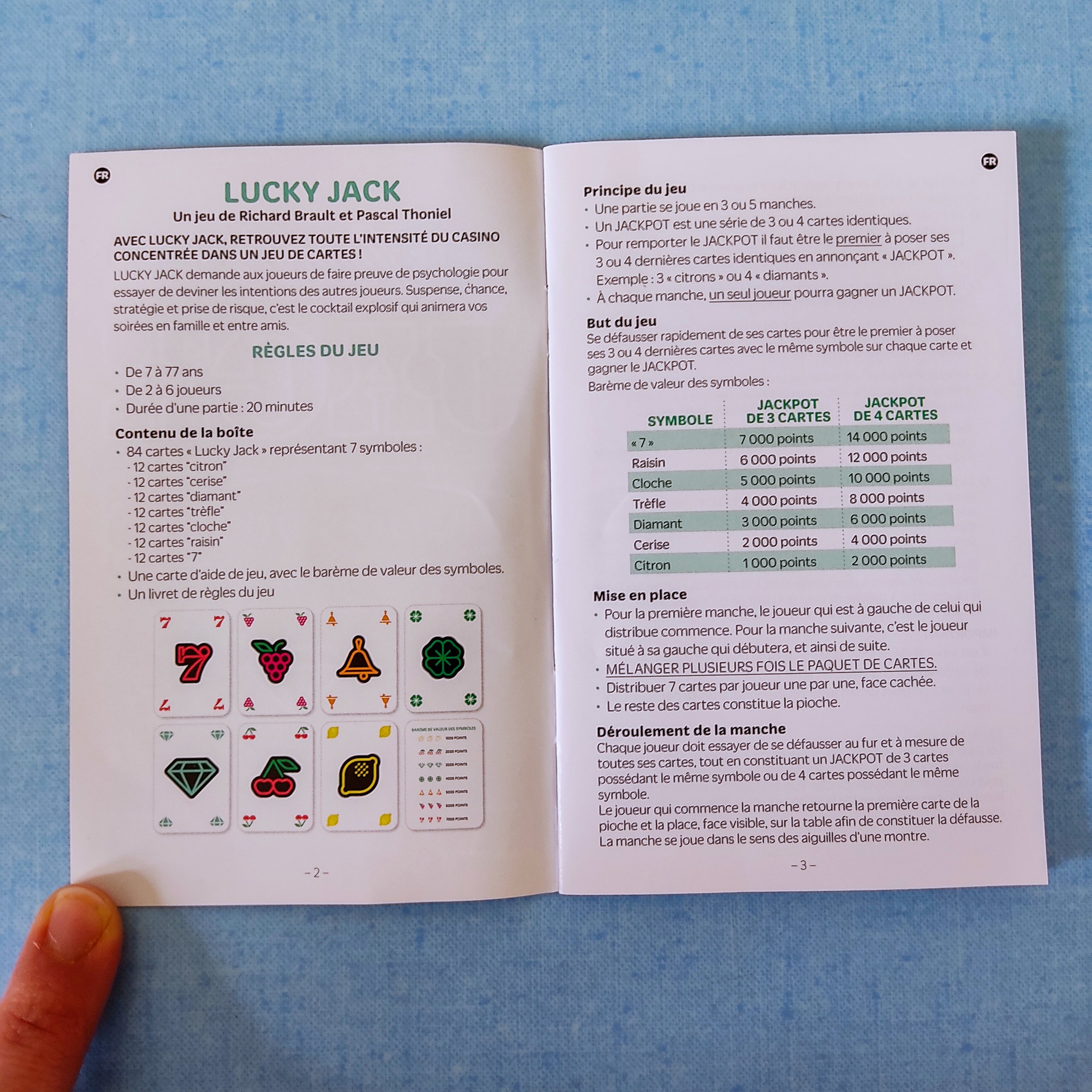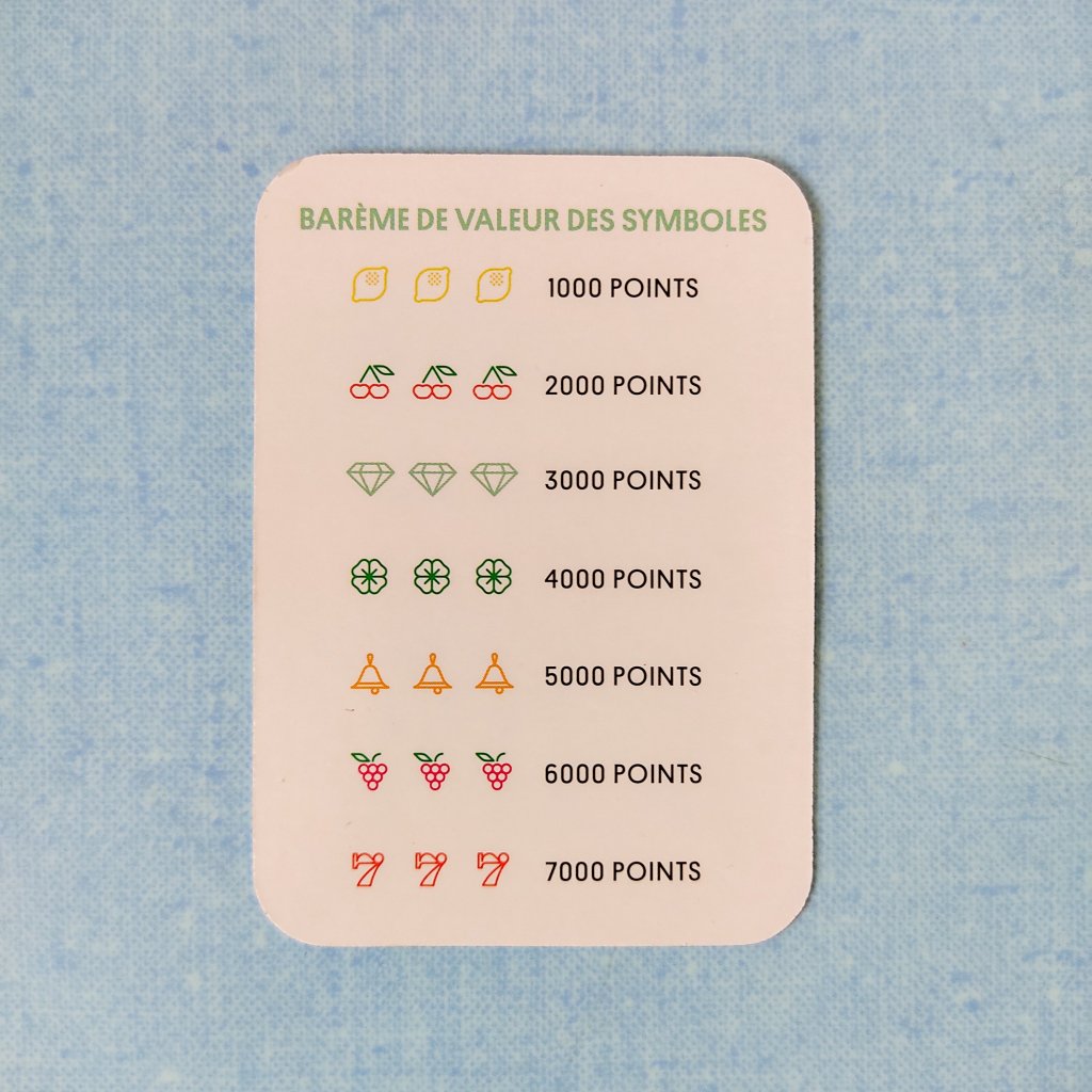 But du jeu : Se défausser rapidement et habilement de toutes ses cartes sauf 3 ou 4, afin de poser en premier un jackpot, c’est à dire 3 ou 4 cartes affichant le même symbole. Le jeu comporte 7 symboles rapportant de 1000 à 7000 points.