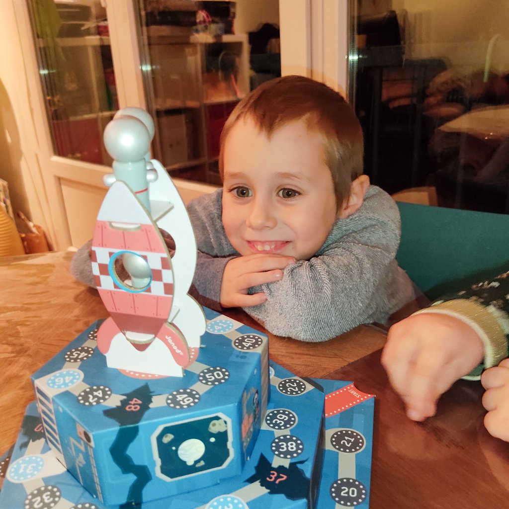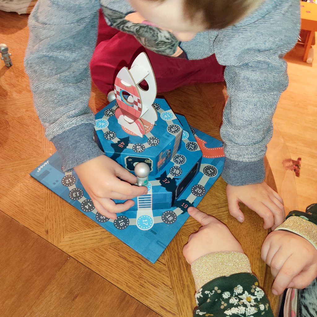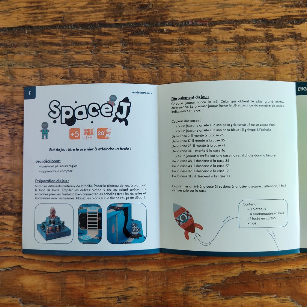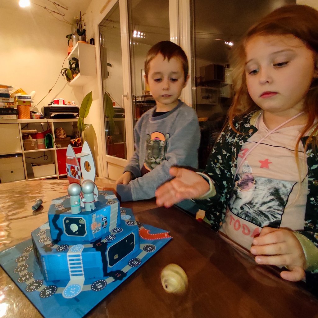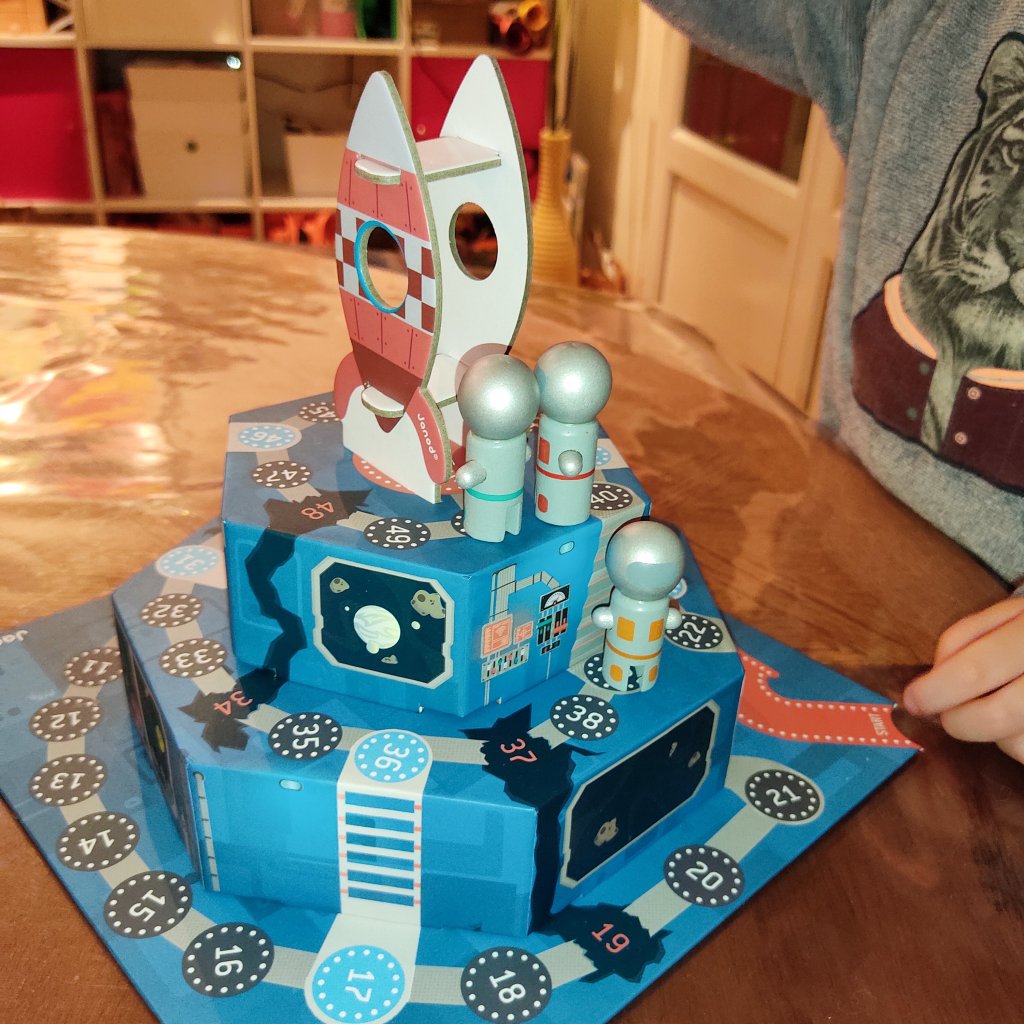 Zoé nous a mis la pâtée dès la première partie (Elle a eu toutes les échelles, alors qu’on était encore en bas! 😅) Mais on s’est bien rattrapé par la suite, Basile était fier d’arriver en haut de la fusée. (Léon lui ce qu’il aime ce sont les dés. 🤭 Peu importe la taille ou la couleur, c’est son truc.) Léger bémol sur le fait que les cosmonautes tombent facilement du plateau dès lors qu’on le bouge un peu.