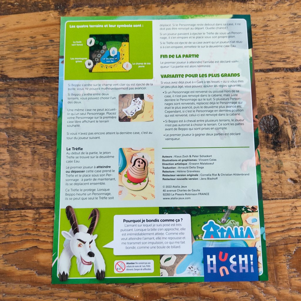 Notre avis : Alors niveau mise en place du plateau, rien de plus simple, puisqu’il se pose sur la boîte et hop le tour est joué! 2 trous pour pouvoir mettre la rampe de lancement, comme ça, peu importe l’orientation initial du plateau. Tous les joueurs placent leur pion sur le départ, Beppo le bouc est placé sur la zone aimanté. Le jeu est en place, on peut démarrer!
