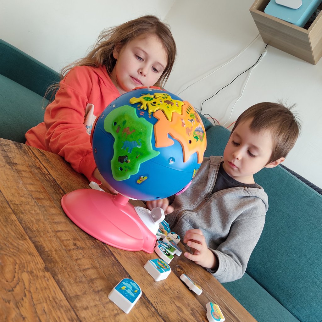 « Un globe interactif électronique en plastique recyclé, avec des continents et des animaux à encastrer, pour tout savoir sur les animaux et leur habitat.