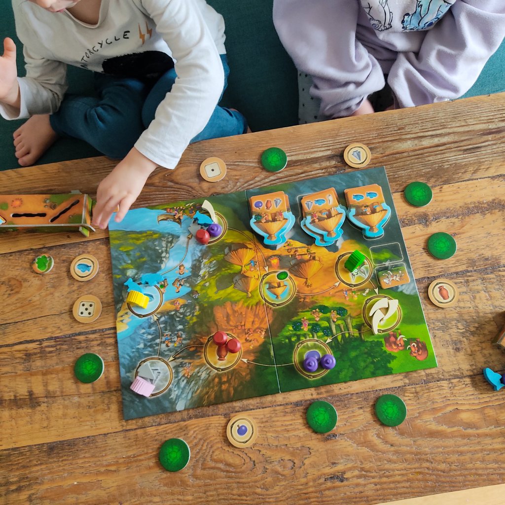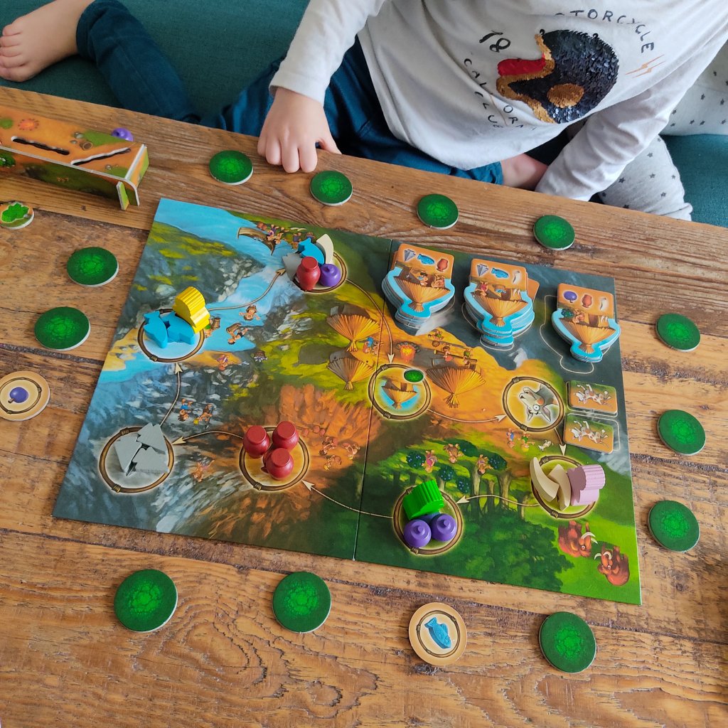 La mise en place du jeu est rapide, les enfants ont été très vite attirés par les dessins et les pièces en bois. Chaque joueur a une figurine de la couleur de son choix (enfin dans la limite de 4 choix 😅), et un village devant lui (genre de chevalet). Les figurines de chaque joueur sont placés au centre du plateau.