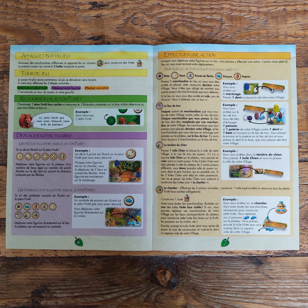 Un tour se déroule en 3 actions, au cours duquel les joueurs ne lancent pas de dés mais retournent un jeton forêt autour du plateau. Chaque jeton représente soit un chiffre (de 1 à 6), soit des marchandises à collecter. La figurine est ensuite déplacée selon le pion retourné. Enfin on effectue l’action : soit récupérer une marchandise, troquer une marchandise, embarquer le chien Paf (Oui oui, Paf le chien 😂)(Paf est un joker!) ou créer une hutte. Note bien qu’en trouvant la case chantier pour construire sa hutte, tous les pions forêts déjà retournés doivent être remis face cachée. Il faut donc bien observer le lieu de chaque marchandise pour pouvoir la tirer au tour suivant si tu en as besoin.
