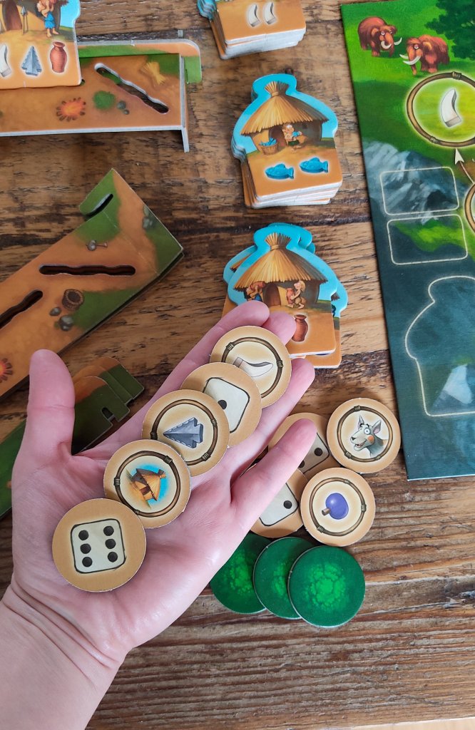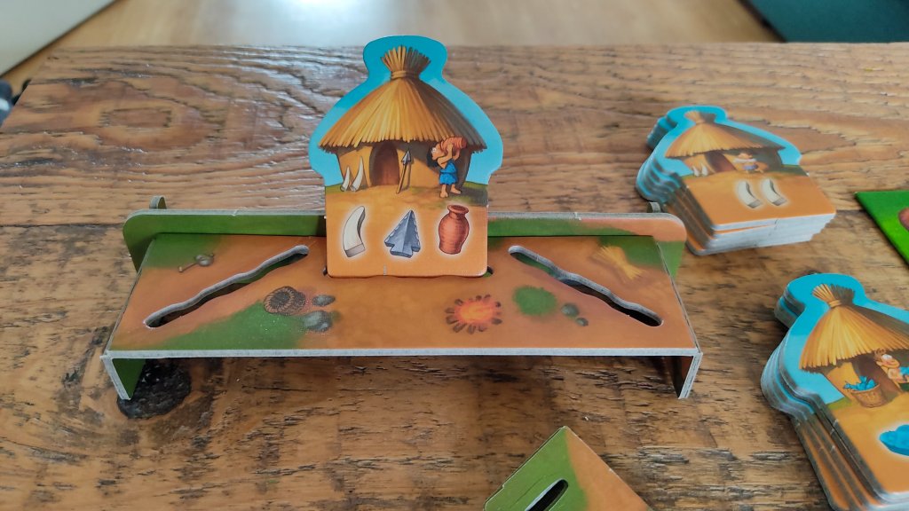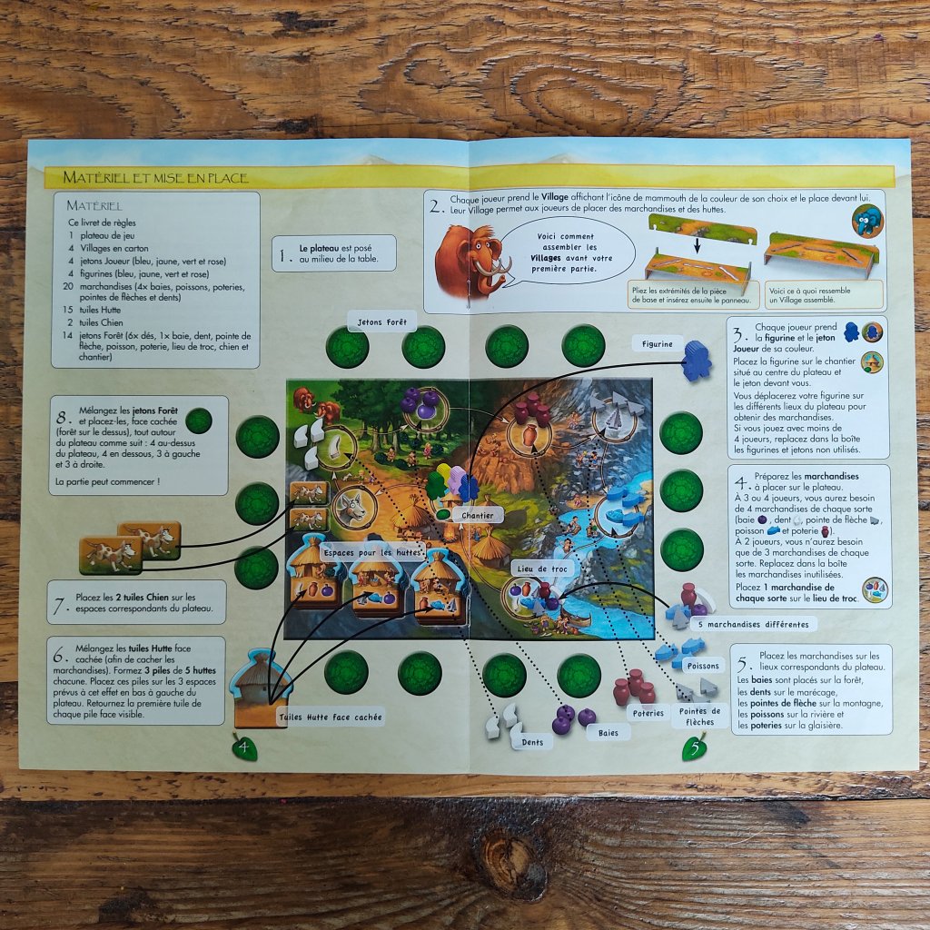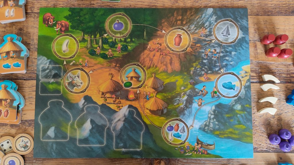 Le plateau de jeu est magnifiquement illustré, avec des dessins colorés représentant des bêtes préhistoriques, des ressources telles que les dents, les poteries ou les baies, et des structures telles que les huttes. Le but du jeu est de collecter suffisamment de ressources pour construire de nouvelles structures et développer son village. Le joueur qui arrive à construire 3 huttes en premier remporte la partie.