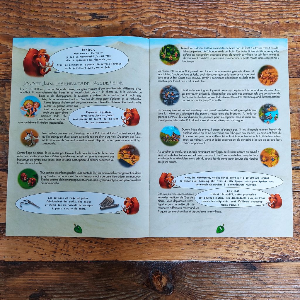 « Créé par Marco Teubner, ce jeu est une version simplifiée du célèbre jeu de stratégie L’Âge de Pierre, adapté pour les enfants âgés de 5 ans et plus. Dans ce jeu, les joueurs jouent le rôle de membres d’une tribu préhistorique, essayant de survivre en collectant des ressources et en construisant des structures pour leur village. Avec Jono et Jada, ils exploreront le monde, construiront une maison de A à Z, cueilleront des baies, pêcheront et vivront des aventures palpitantes. »