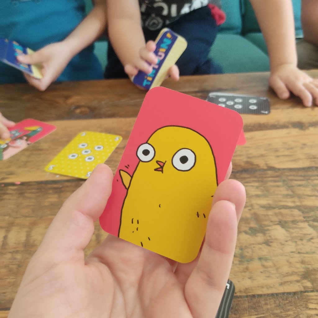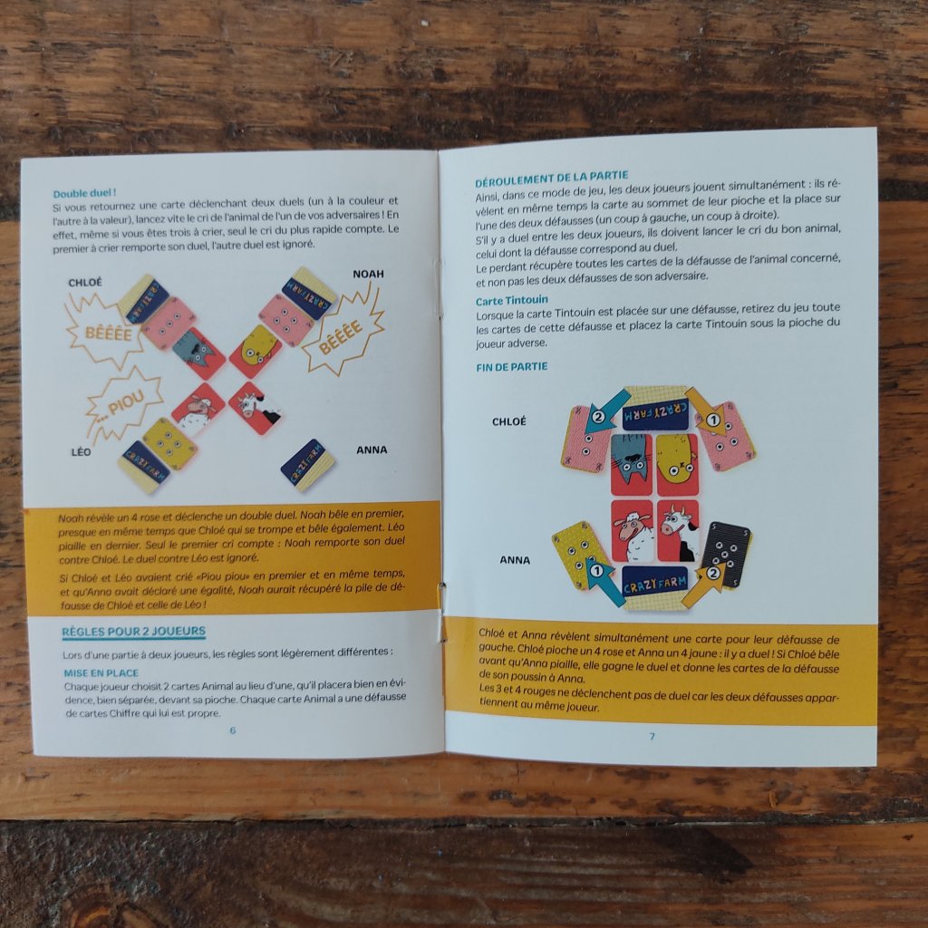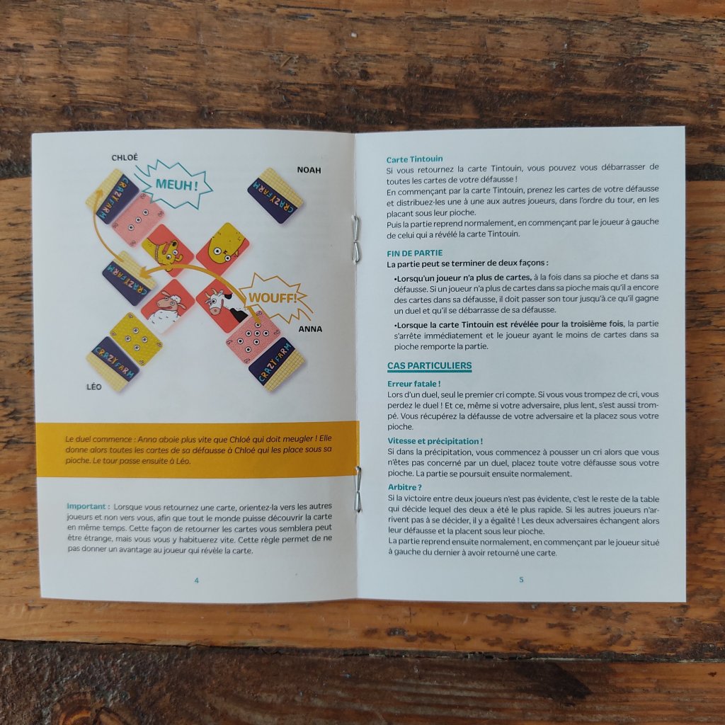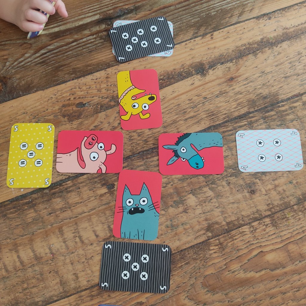 En pratique, notre carte animal est placée devant nous, et à tour de rôle, on retourne les cartes de notre main. Quand l’une des cartes a le même chiffre ou le même motif qu’une carte déjà sortie, on pousse le cri de l’animal de l’adversaire. On donne alors notre pli à l’autre et on reprend avec le joueur situé à gauche. On joue jusqu’à ce que le premier n’ait plus de cartes. Si quelqu’un sort la carte Tintouin (avec tous les animaux dessus), il peut distribuer toutes les cartes de sa défausse. Cette carte est très intéressante si tu ne la sors pas dès le premier tour. 🤪