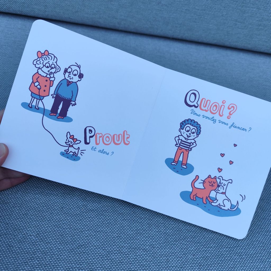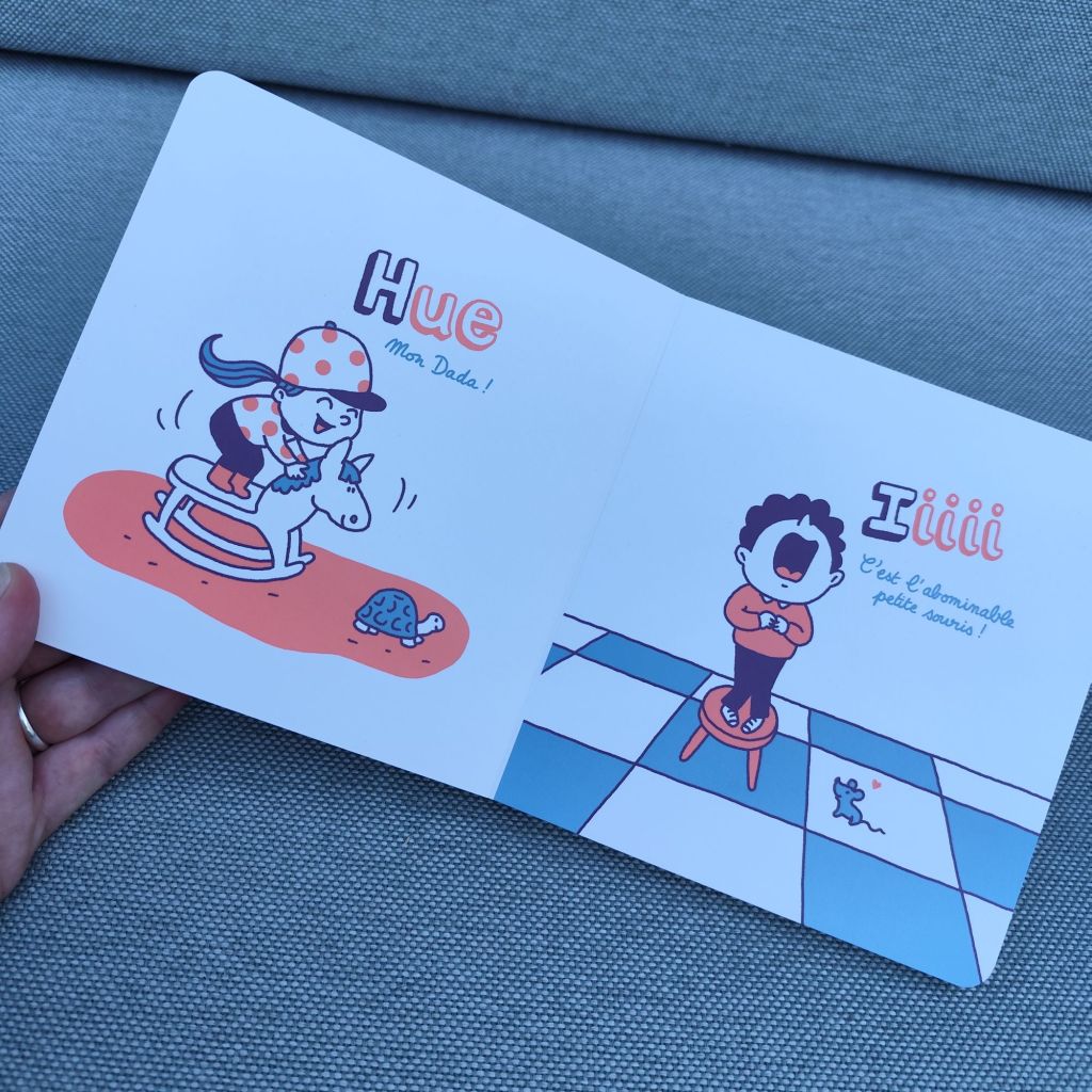 Le résumé : « De « Ahaha » à « Zou », en passant par le « Floc » dans les flaques et le « Tic tac » du réveil, les tout-petits découvrent l’alphabet à travers leurs onomatopées préférées, accompagnées de désopilantes illustrations.