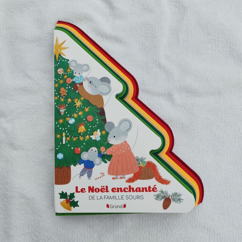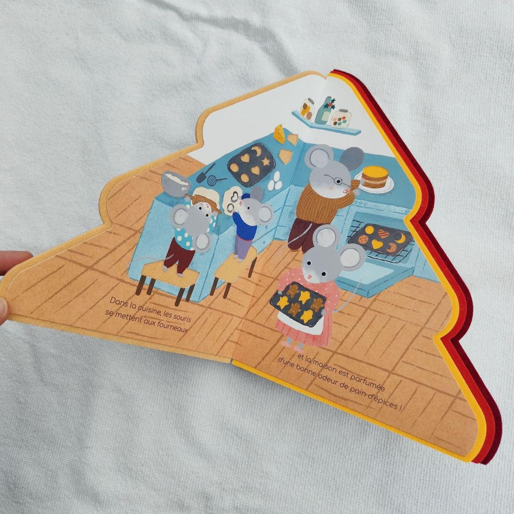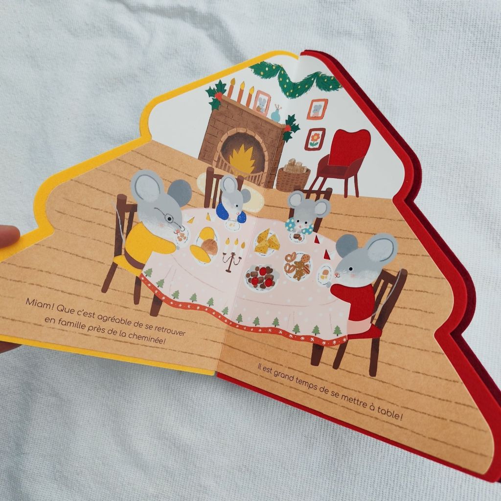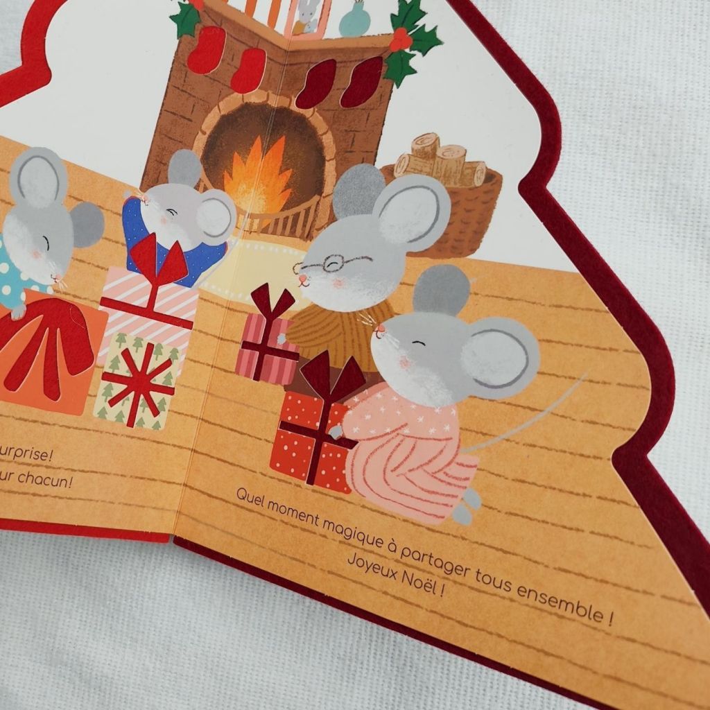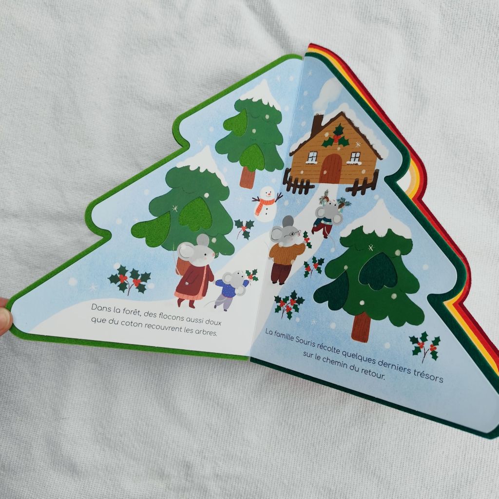 Notre avis : Passion arc-en-ciel pour Léon, du coup, même s’il est un peu grand pour ce livre, ça reste un très bel ouvrage coloré pour enfants. On suit la famille souris dans leurs préparatifs et on en profite pour toucher la feutrine sur les bords et à l’intérieur des pages. La forme du livre en sapin est originale et très agréable dans la prise en mains.