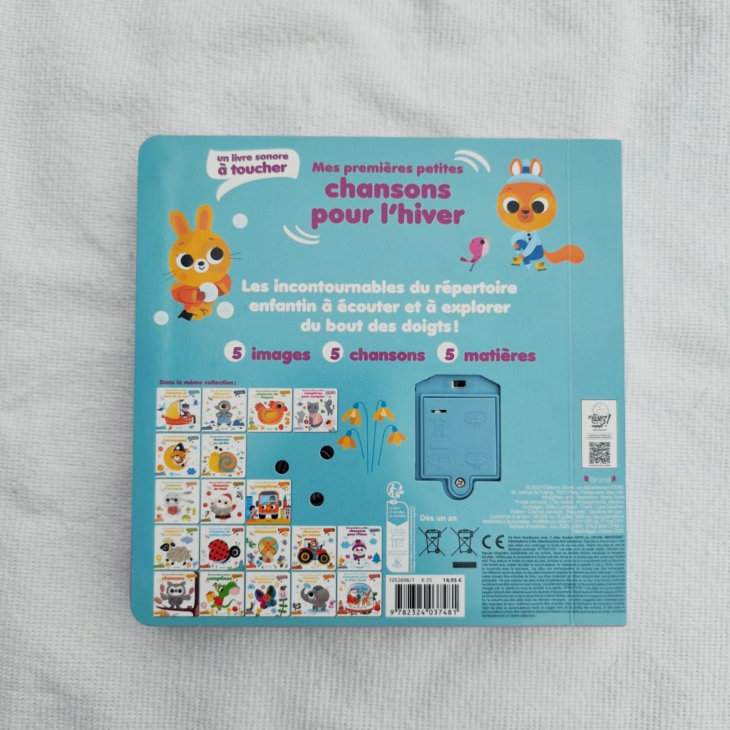Le concept : Dans cet ouvrage, on retrouve 5 puces sonores de 15 secondes et 5 matières à toucher variés (paillettes, laine, etc.)!