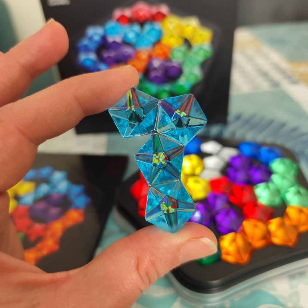 Le contenu : Dans la boîte, tu trouveras 1 plateau pentagonal avec couvercle, 11 pièces transparentes, 1 livret comportant 120 défis et leurs solutions, 1 livret de règles.