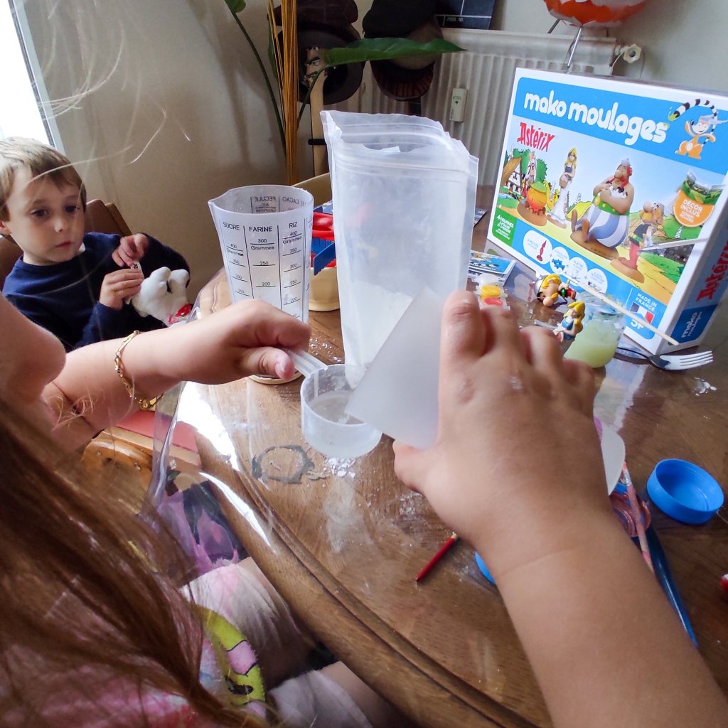 – Une activité adaptée aux enfants de plus de 5 ans du début à la fin. (Bon je suis restée à côté pour une légère aide niveau mélange des couleurs, mais en vrai la notice imagée est très facile à comprendre, le principe également.) Basile (4 ans et demi pour les nouveaux!) a surtout aimé peindre sa figurine. Je l’ai aidé pour le mélange. En revanche, Zoé (7 ans et demi) a tout fait seule, démoulage compris.